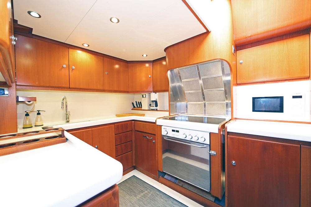 . The professional galley is equipped with a Miele stainless-steel ceramic hob mounted on a gimbal, extractor