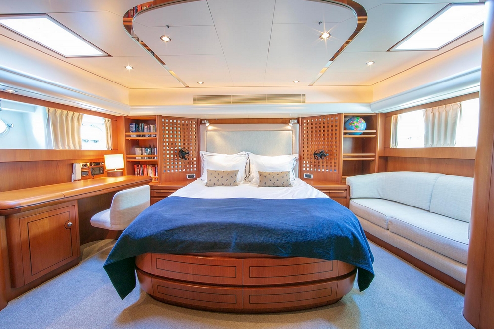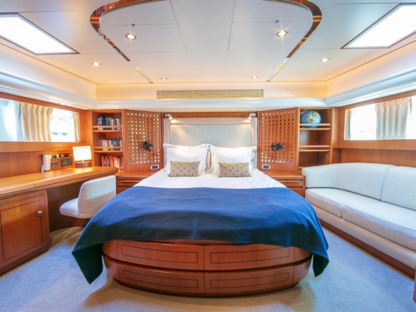 . The owner's aft cabin spans the full beam of the boat. It is furnished with a queen-size bed, a sofa, a desk, a