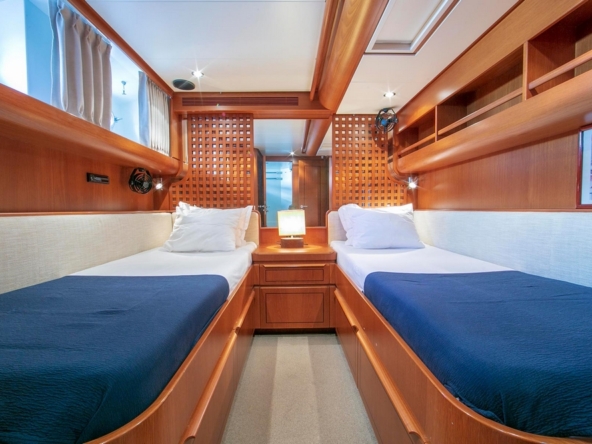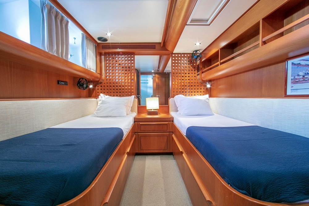 . Two identical cabins, each with twin beds and storage drawers underneath, wardrobes, and bookshelves.