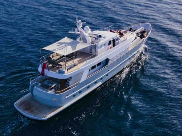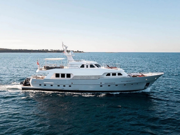 This yacht, designed by Verme Projects, boasts a powerful and sporty design, with its hull and superstructure fully white topped by an elegant hardtop. Built in GRP by Permare Italian shipyard, she offers excellent seakeeping and combines robustness, reliability, and exceptional comfort.