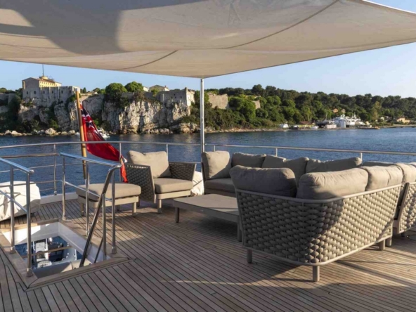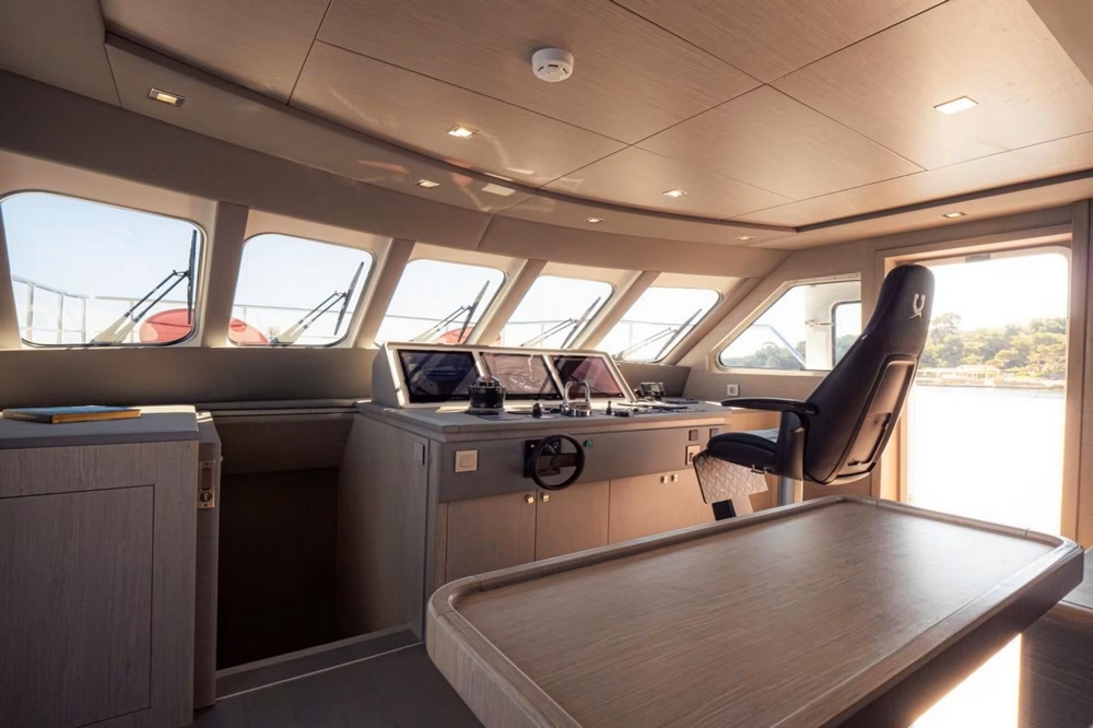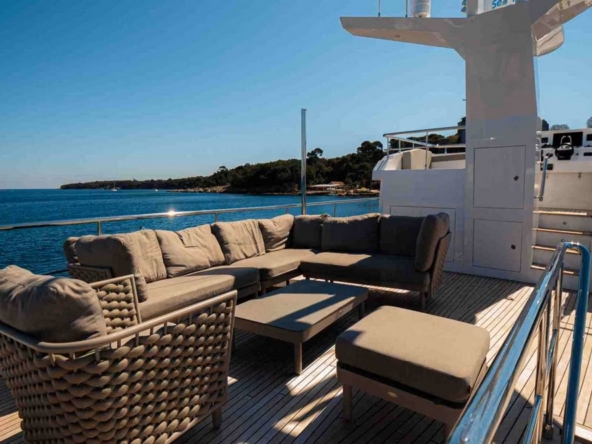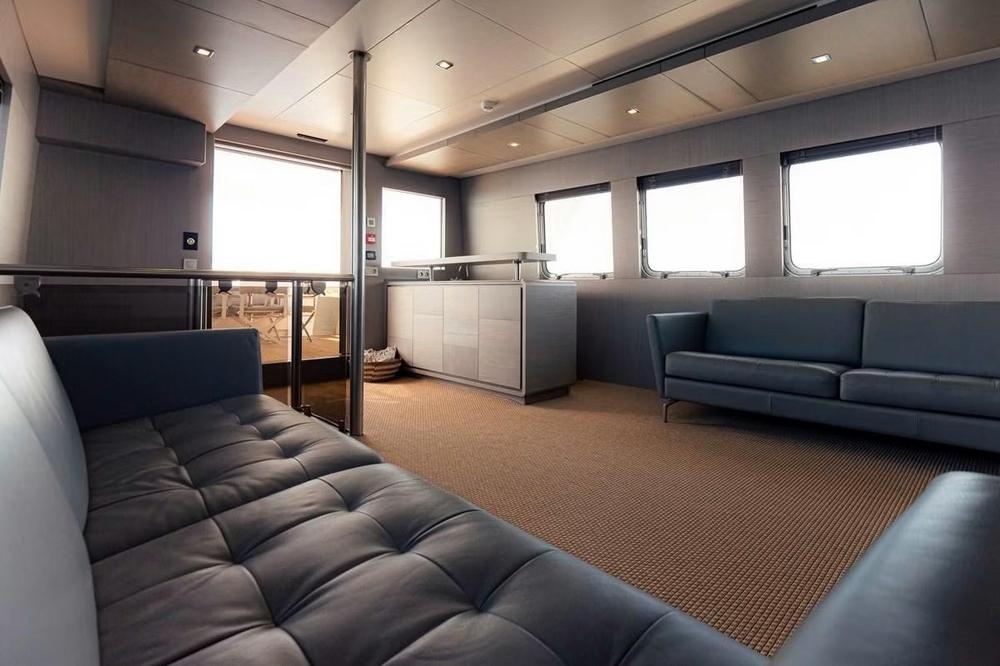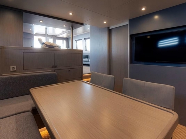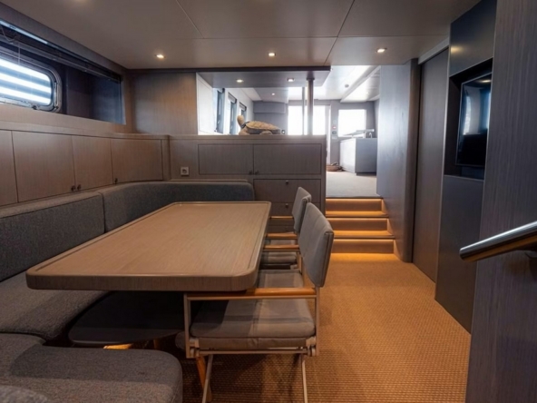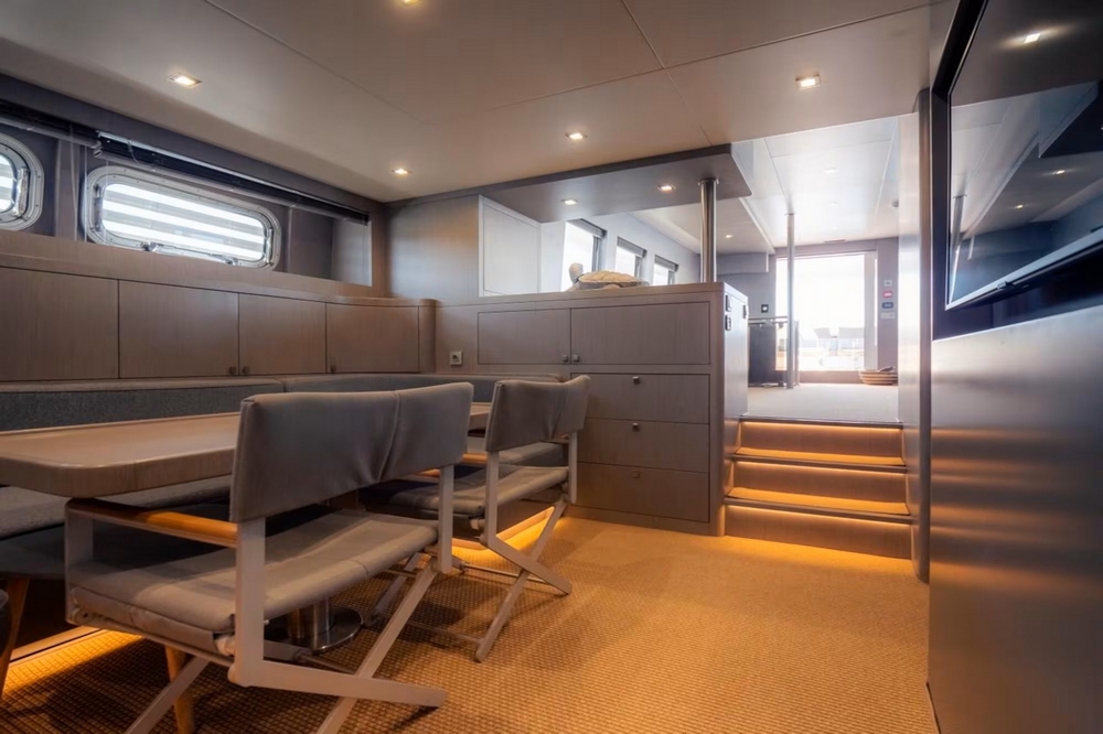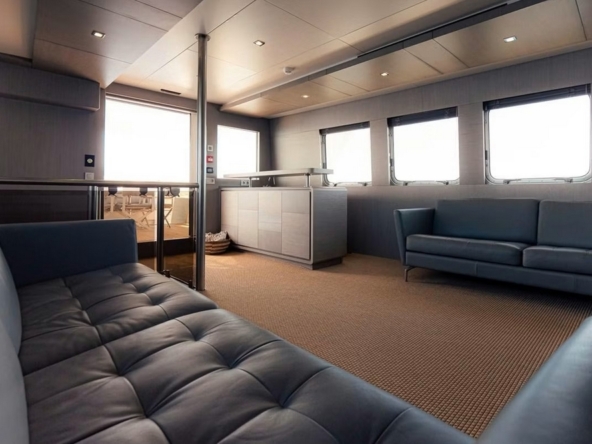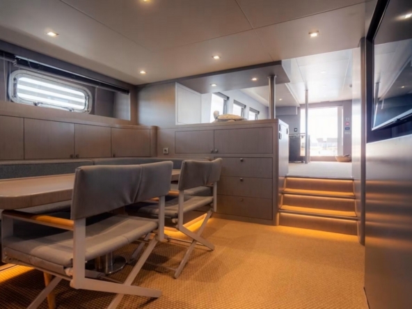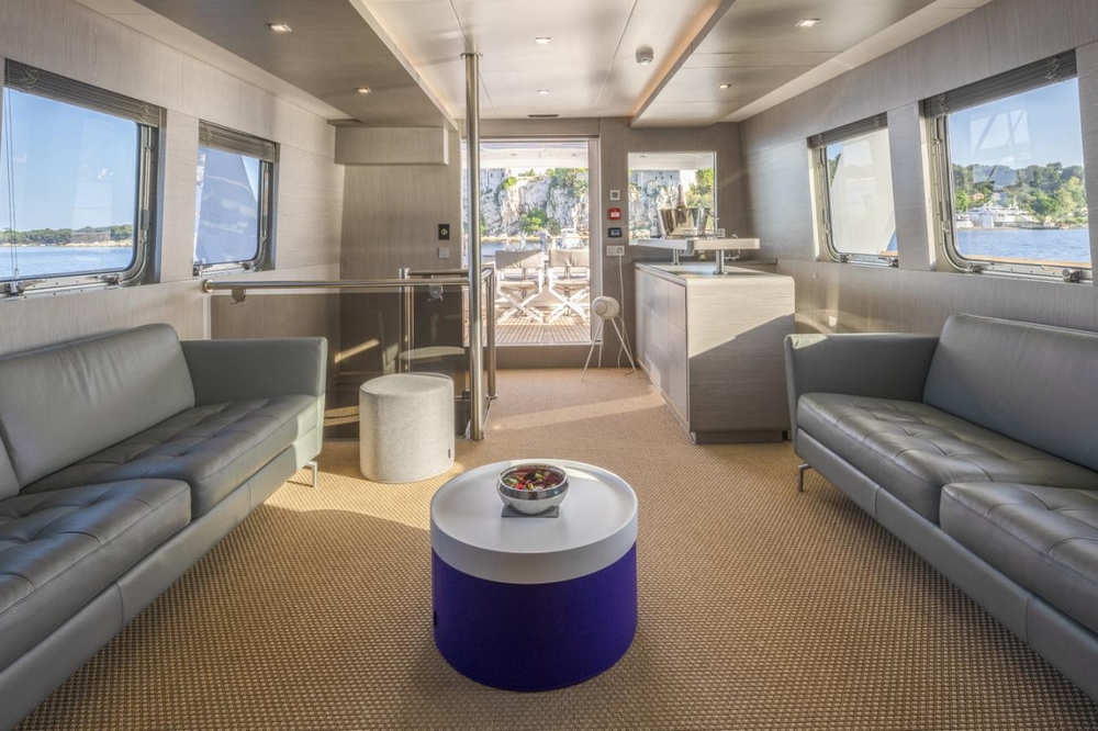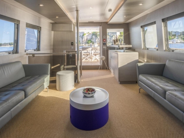A sliding glass door provides access to the interior of the main deck. The space is bathed in natural light from six large side windows. It is sumptuous, with warm wood joinery, cream upholstery, and luxurious ceilings.