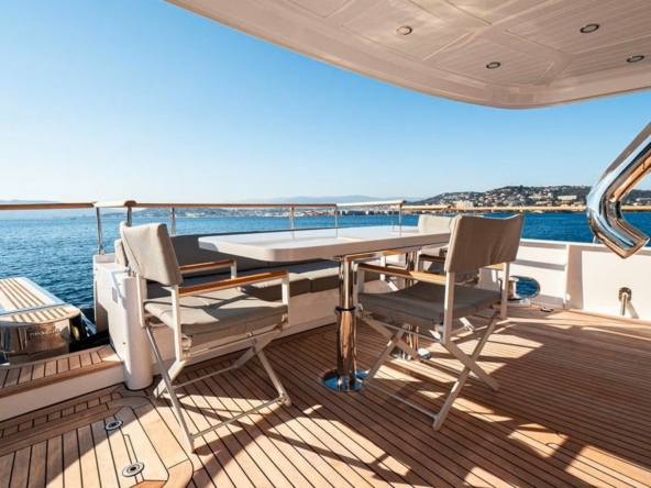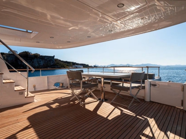 Sheltered under the flybridge overhang, the cockpit is configured as a second outdoor dining area, featuring a handsome teak table mounted on two adjustable legs, surrounded by a U-shaped bench and three armchairs. To port, a bar, with sink, refrigerator, and icemaker, faces the steps leading to the flybridge to starboard. Two waterproof Sony speakers and a surveillance camera complete the equipment.