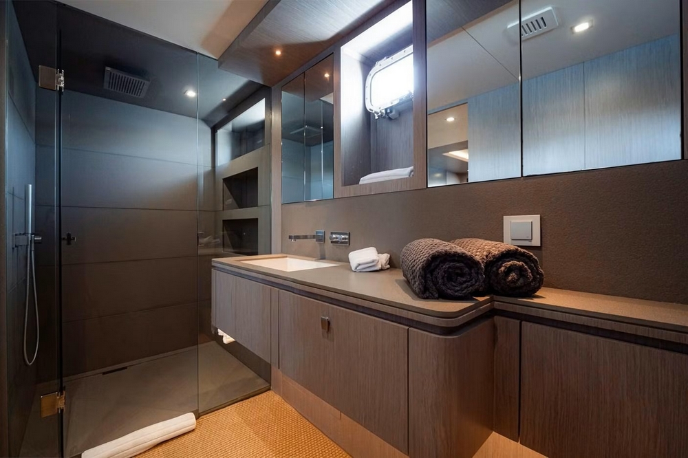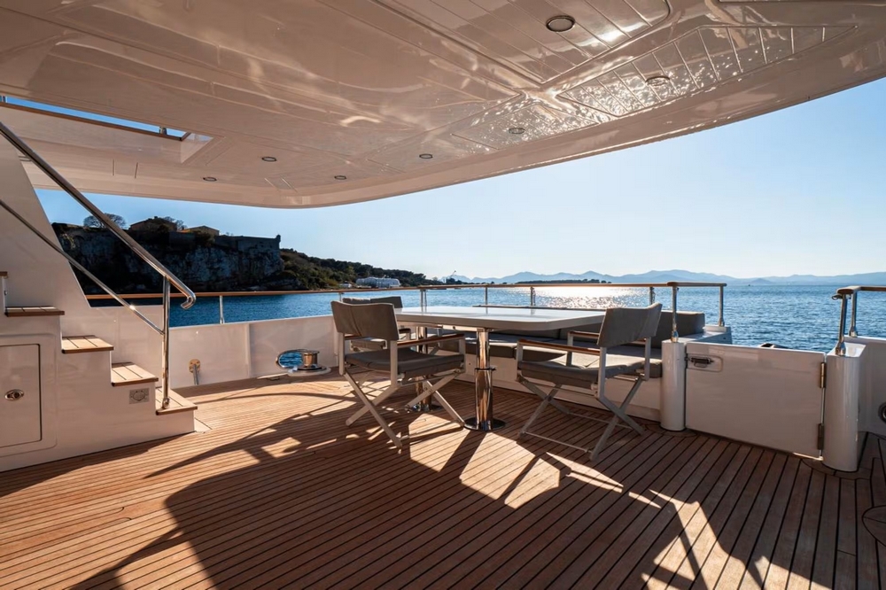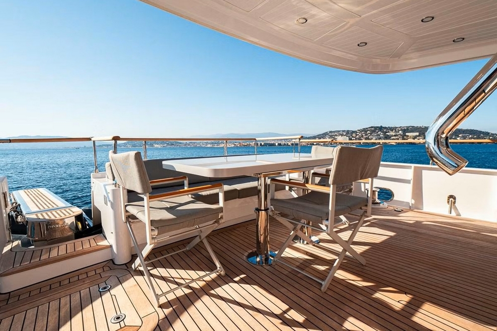 The flybridge is spacious with three deckchairs and a square jacuzzi on aft. Two carbon fiber poles allow for the deployment of an awning to provide shade in this area. A transverse dining area, with an L-shaped settee and three chairs around a teak table, is located amidships, near two bars equipped with sink, barbecue, refrigerator, and icemaker. This area is protected by the hardtop with an integrated sunroof. The pilot station, with its two-person helm seat, is located forward on the starboard side, while another two-person bench is on the port side. The equipment is complemented by an RD44 audio system with four waterproof Sony speakers and a FLIR night vision camera.