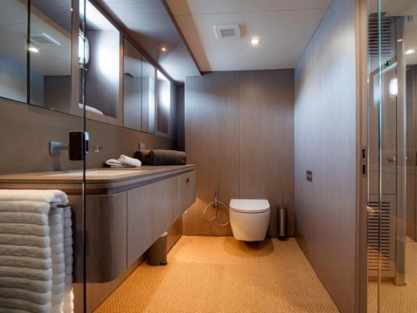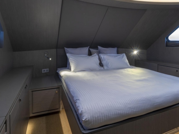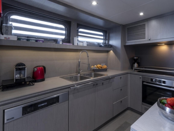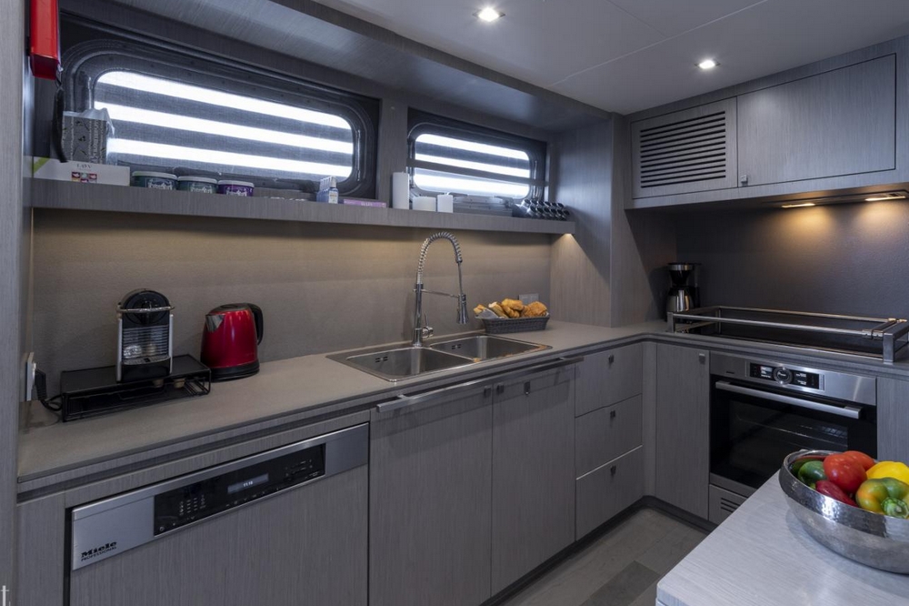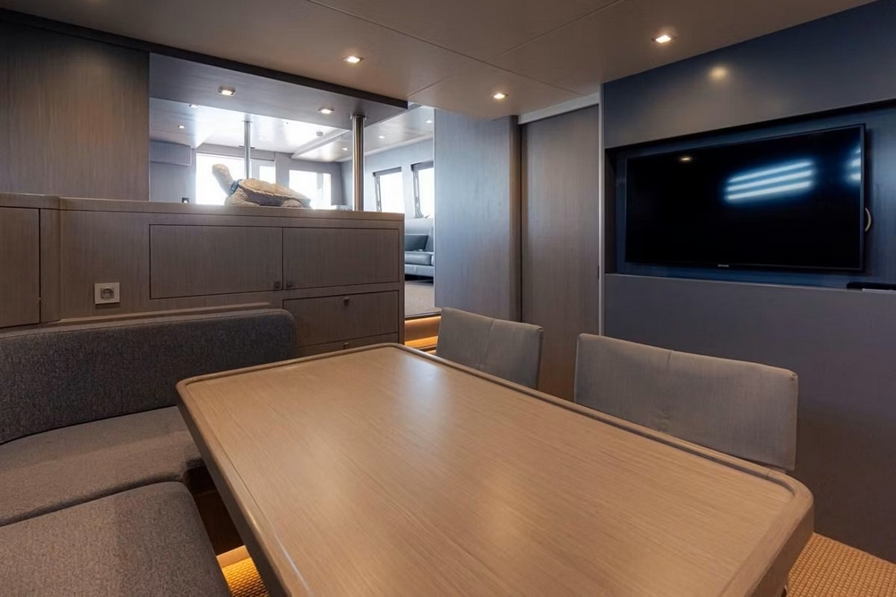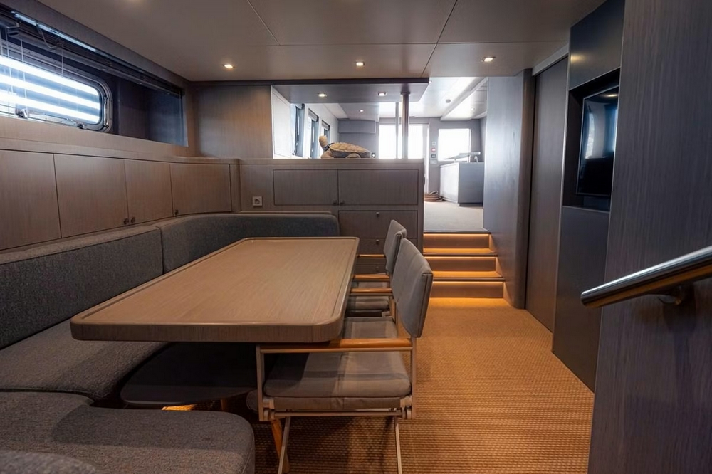 A day head is located at the entrance on the port side, and a storage unit is on the starboard side. The spacious saloon features an L-shaped sofa, an armchair, and two coffee tables, facing a 55-inch Samsung television. The dining room seats six to eight guests around an oval varnished wooden table. The staircase to the wheelhouse is in the port side passageway leading to the galley. This one is modern and all white, fully equipped with Miele appliances: Double sink, 4-burner ceramic hob, extractor hood, 90 cm electric oven, microwave, dishwasher, two refrigerators and two freezers Frigit.