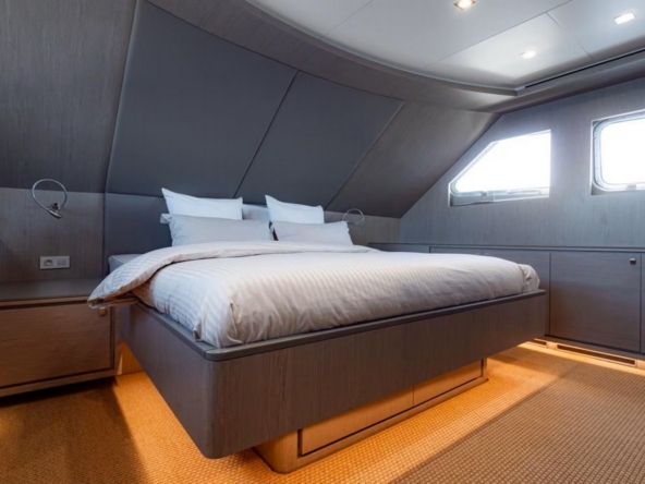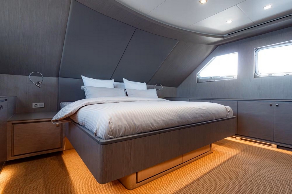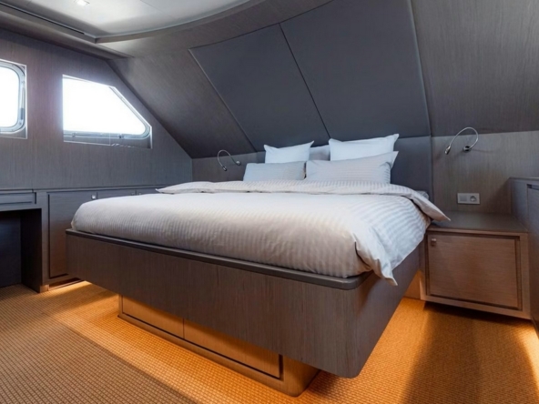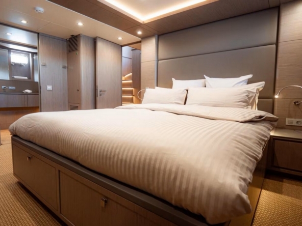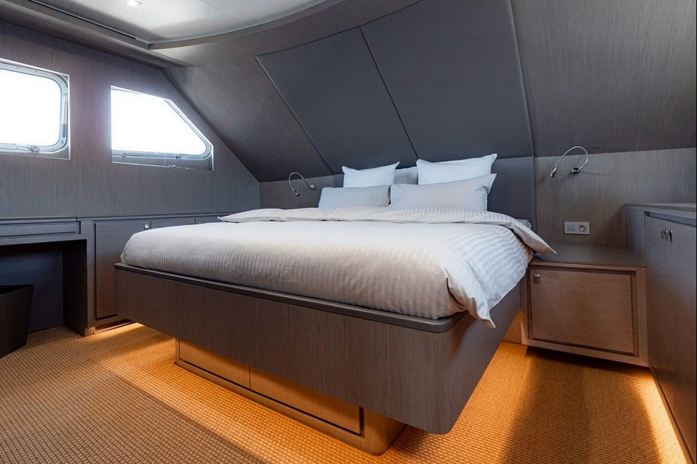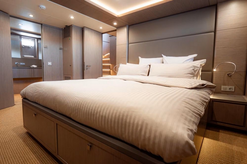 The starboard side passageway leads to the sumptuous owner's suite, which spans the entire beam. It features a king-size bed facing a 55-inch Philips television, a sitting area with two armchairs and a coffee table, vanity, wardrobes, the bathroom, and a staircase leading directly to a large office/lounge on the lower deck.