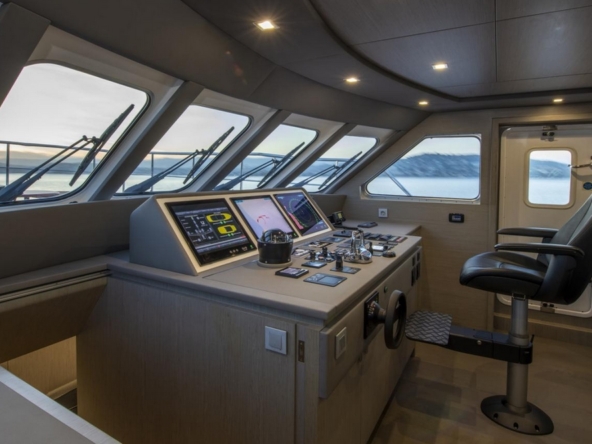 The raised wheelhouse is accessible from the flybridge and the port side passageway on the main deck. It offers a 180-degree panoramic view and is equipped with a large instrument console, a wheel, a comfortable helm chair, a chart table to port, and a sofa to starboard.