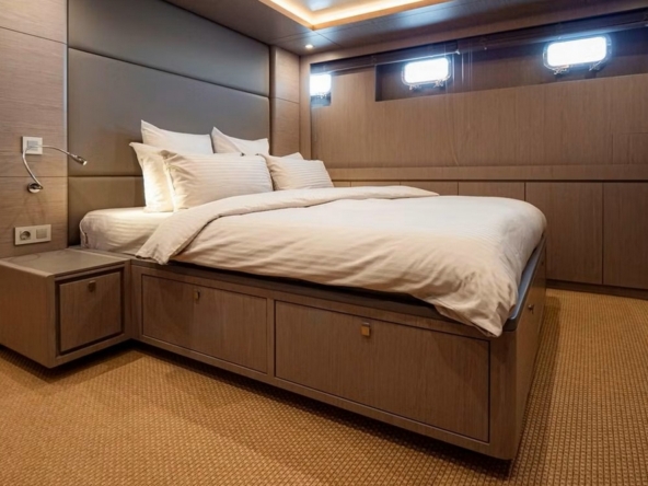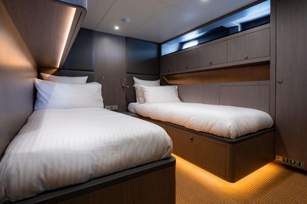 . The forward-third is reserved for crew quarters with two cabins featuring bunk beds and en-suite bathrooms, and the