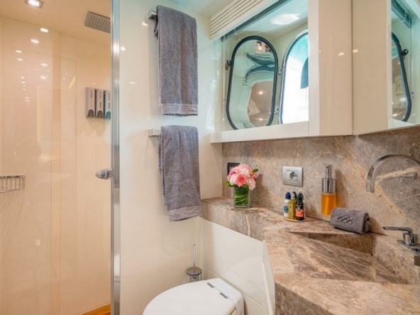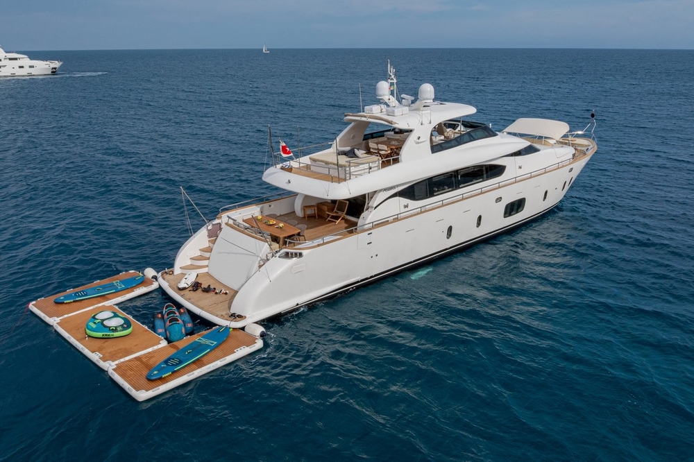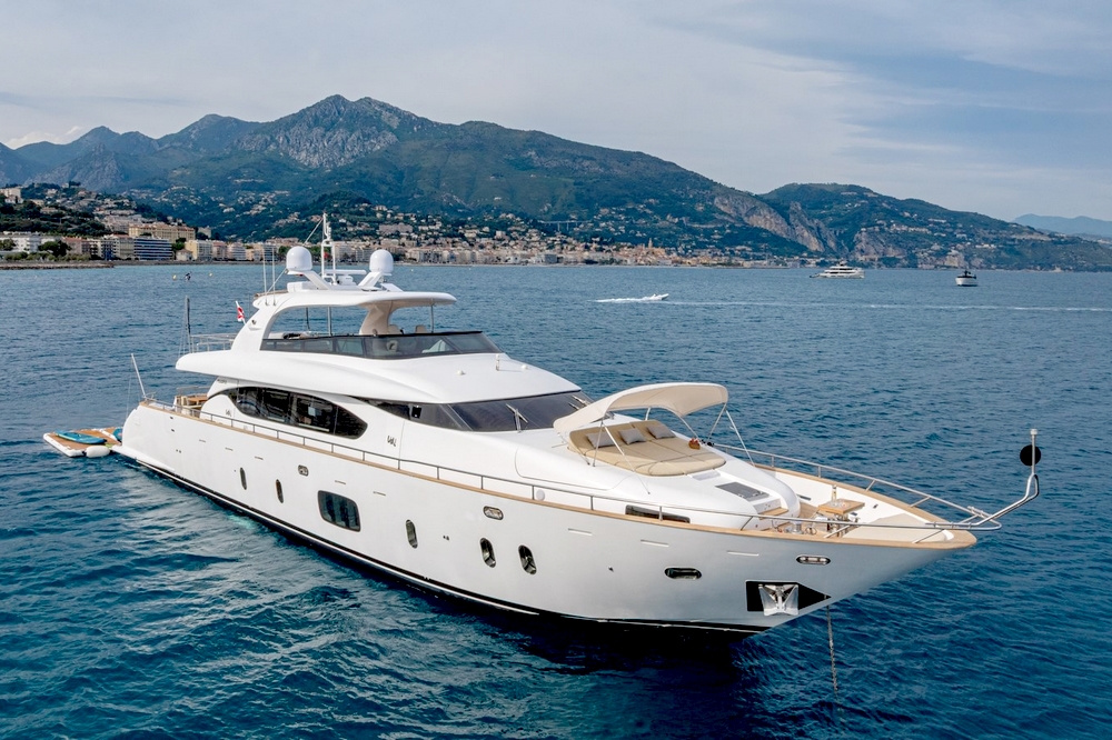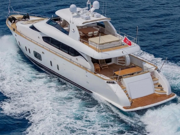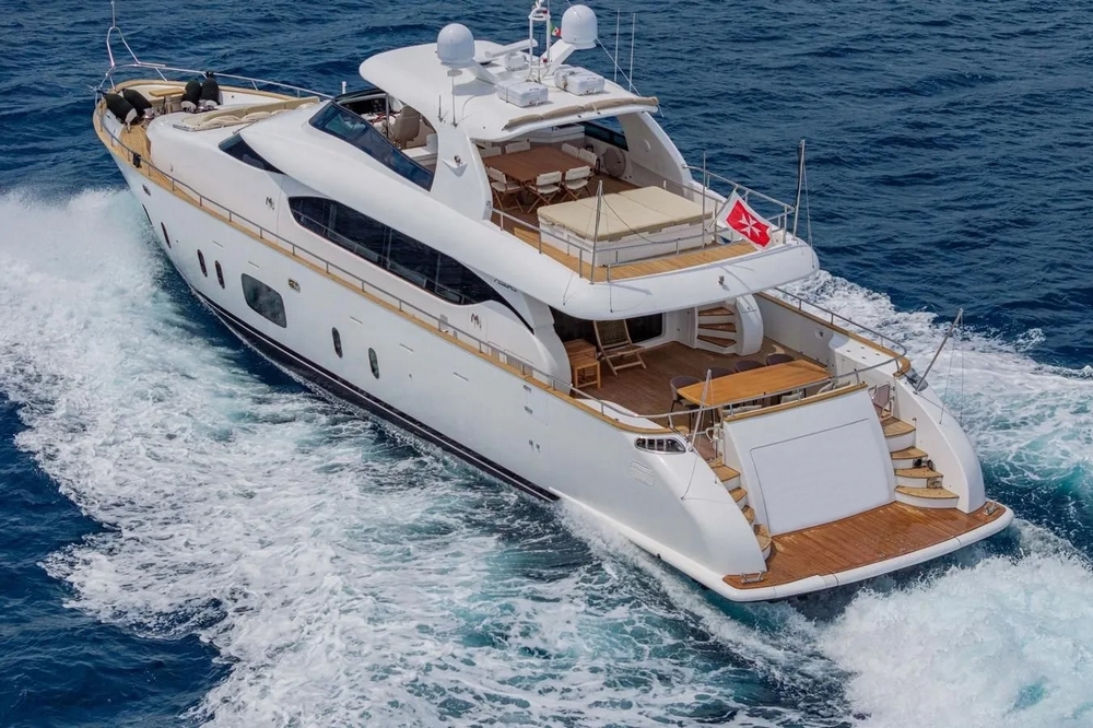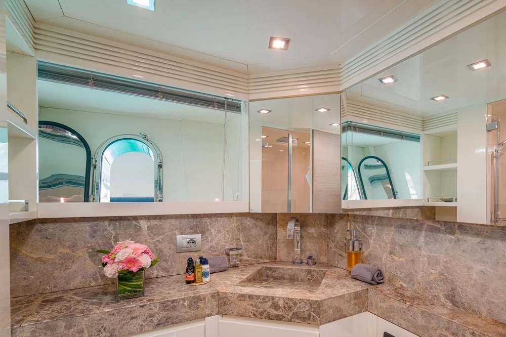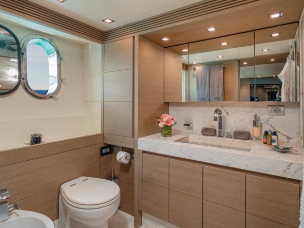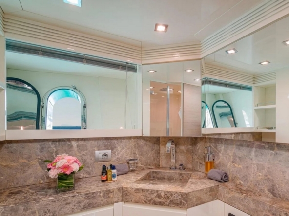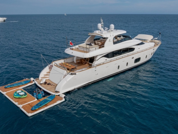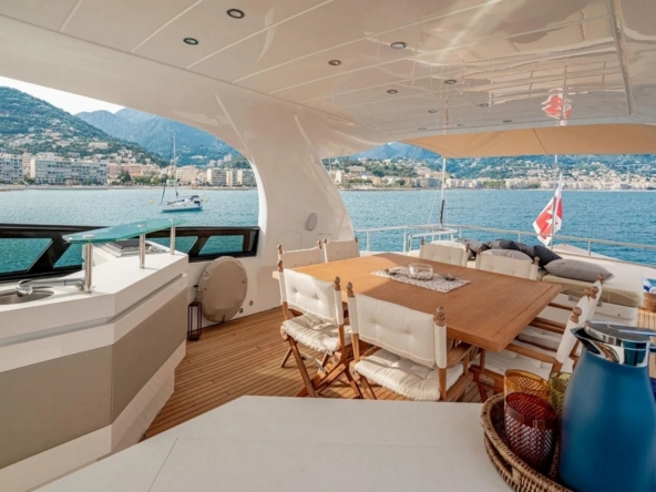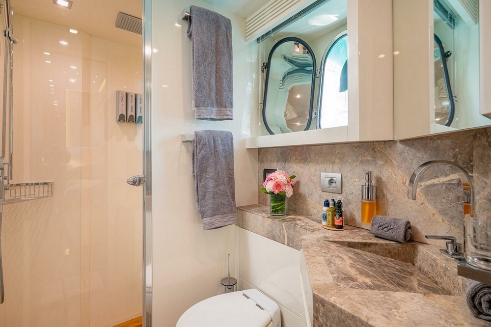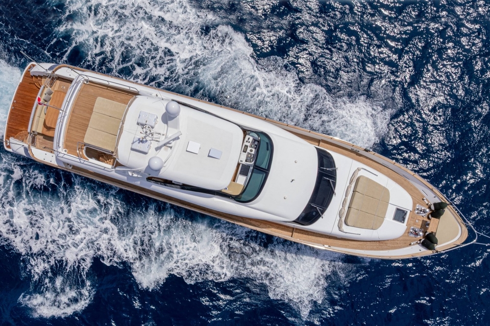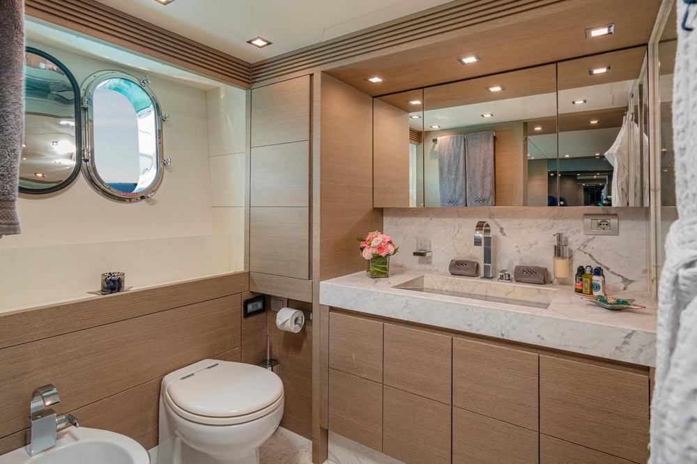 Boat very well equipped, with: CMC hydraulic stabilization systems underway and at anchor, BCS hydraulic bow and stern thrusters, 2 x 37 kW Onan generators, Condaria reverse cycle air conditioning, full Furuno navigation electronics, Starlink satellite communications, 2 x 120 l/h Idromar watermakers, aft garage for the main tender and foredeck garage for the secondary tender, swimming platform, etc…