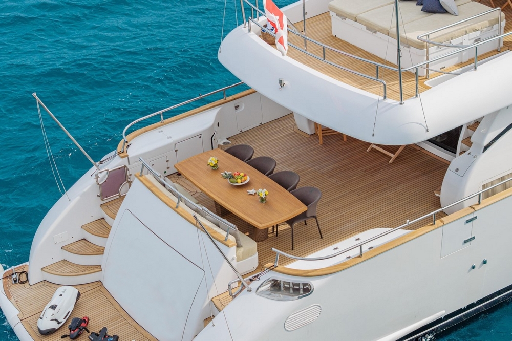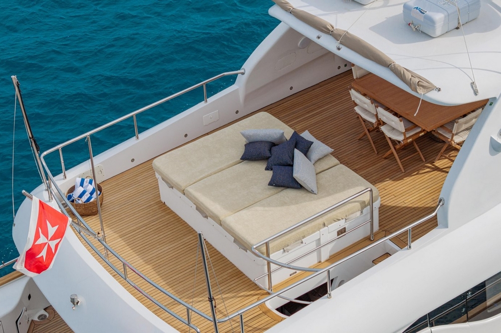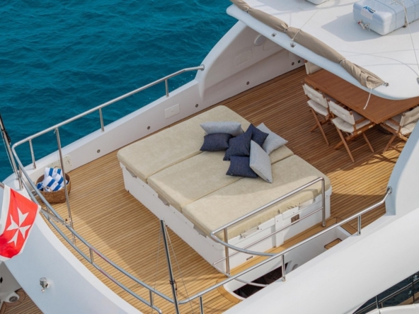 Another sunbathing is located on the foredeck, on the trunk lid of the secondary tender garage, which is maneuvered by a hydraulic crane. It can be shaded by a folding bimini. A small bench and table are on the forepeak.