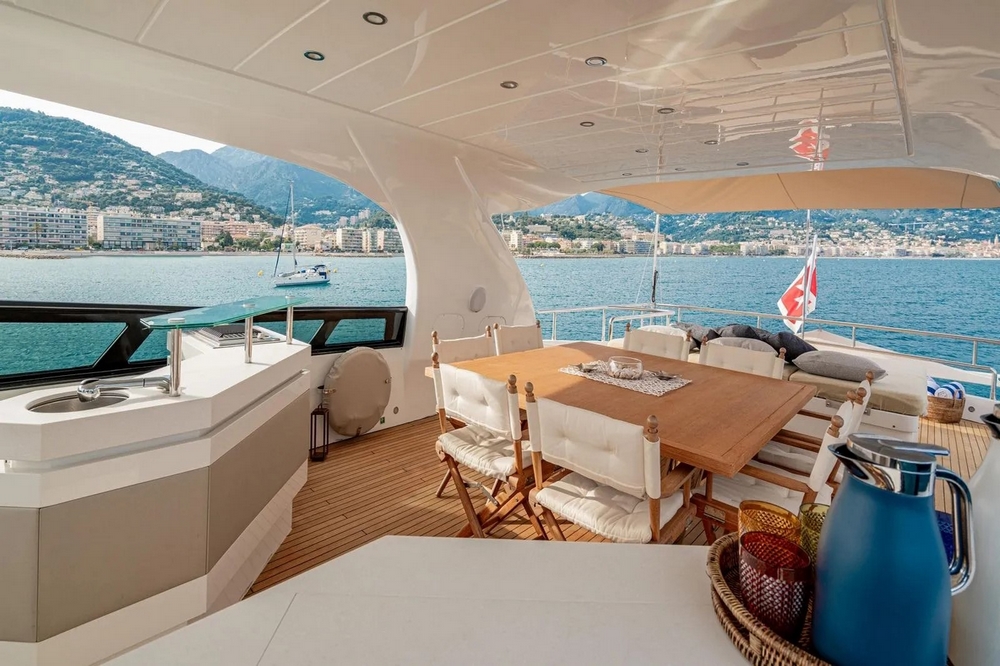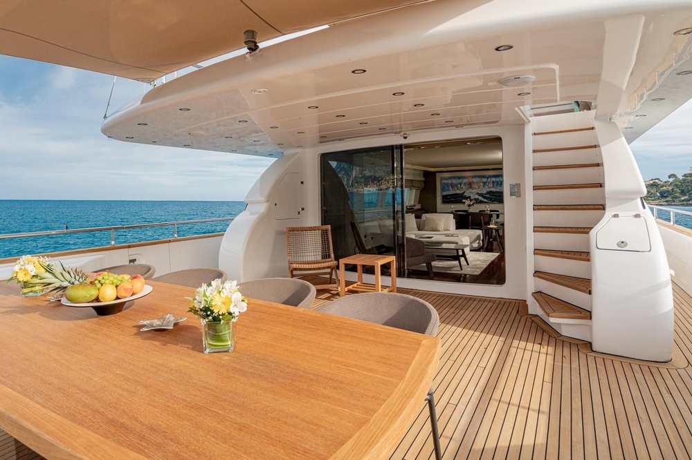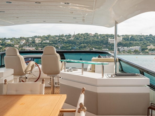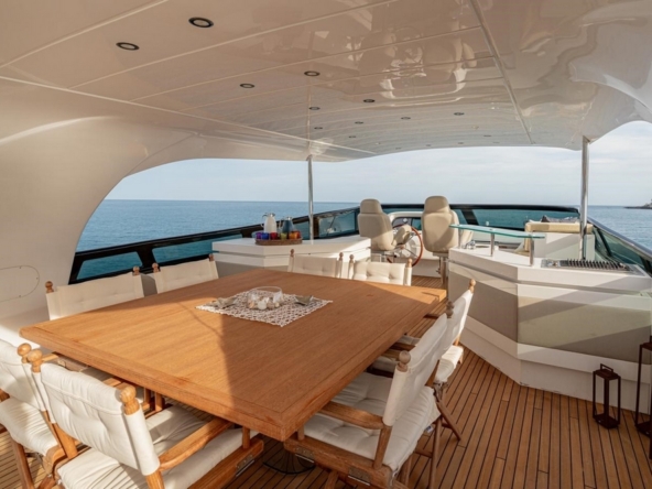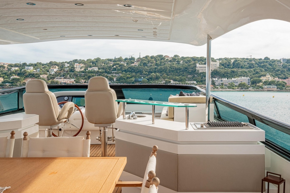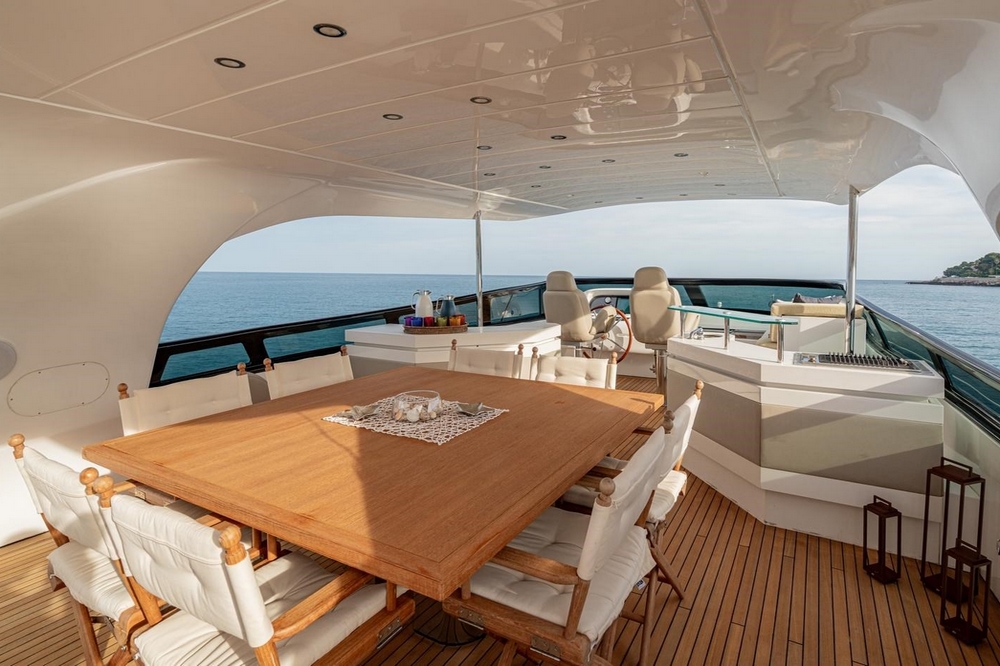 A large rectangular sunbathing occupies the center of the aft flybridge. Sheltered under the rigid hardtop, a dining area can accommodate eight to ten people around its square teak table. Forward, there are two bars equipped with sink, barbecue, refrigerator, and icemaker. The pilot station is on the port side forward with its instrument console, steering wheel, and two comfortable helm chairs, while a sunbathing is to starboard.