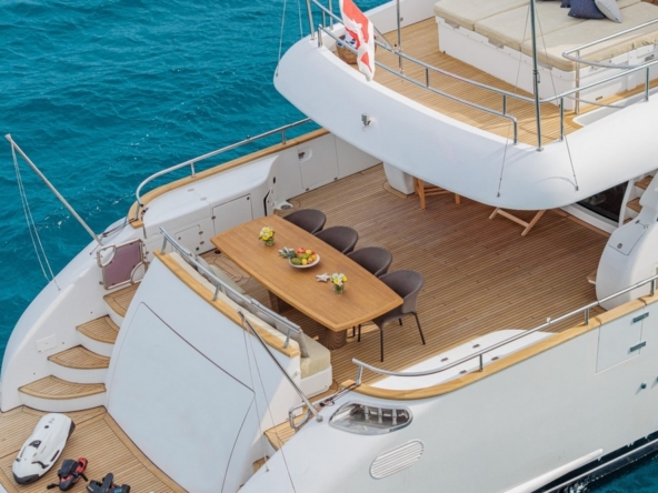 The cockpit is furnished as a second outdoor dining area, with a teak table surrounded by a bench seat and four chairs. It can be shaded with a sun awning.