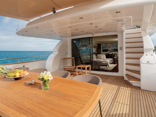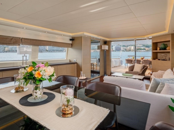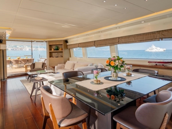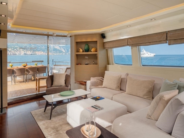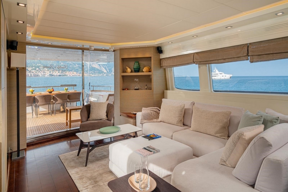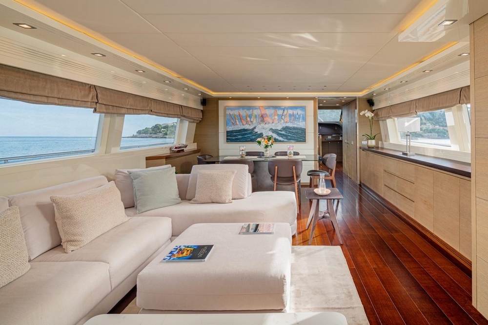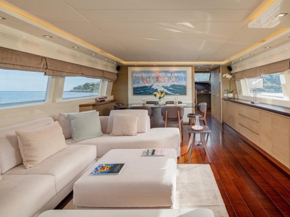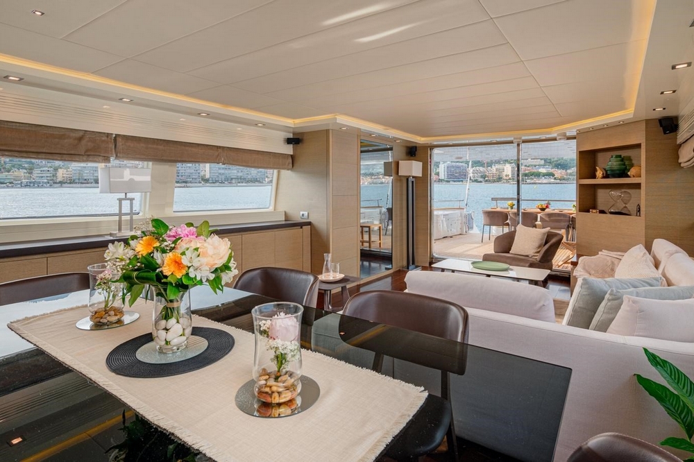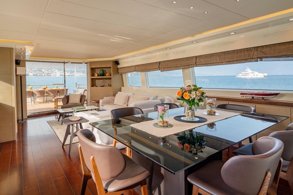 An electric sliding glass door provides access to the interior of the main deck. The design, designed by Maiora, is modern and understated. The pleasant contrast between the mahogany flooring and the white ceilings and upholstery is enhanced by the natural light streaming through the side windows, creating a warm atmosphere.