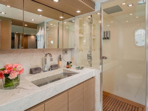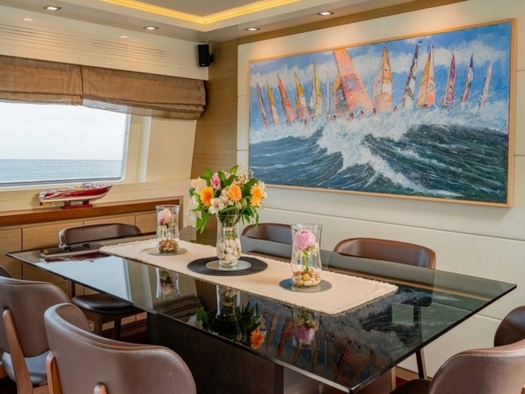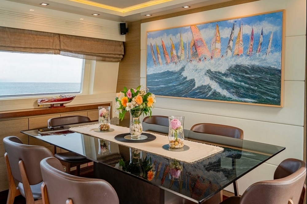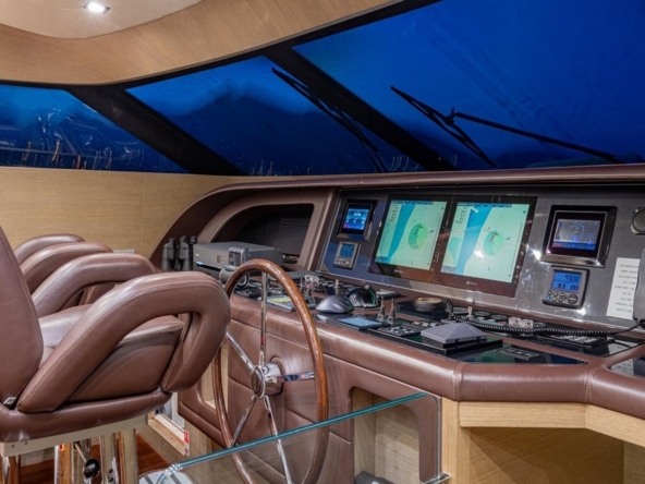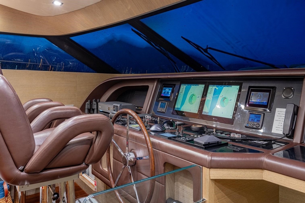 The large main saloon includes an L-shaped sofa and two armchairs in front of a coffee table facing the audio cabinet and television. Forward, the dining room has a glass table and six leather armchairs. The enclosed galley is equipped with a Smeg cooktop, Smeg electric oven, Sub-Zero grill, Smeg dishwasher, GE refrigerator and freezer, and an icemaker. A day head is in the passageway leading to the wheelhouse. This one is located on the port side, with its beautiful instrument console, steering wheel, and two helm chairs. The staircase leading to the lower deck and a watertight door providing access to the gangway are on the starboard side.