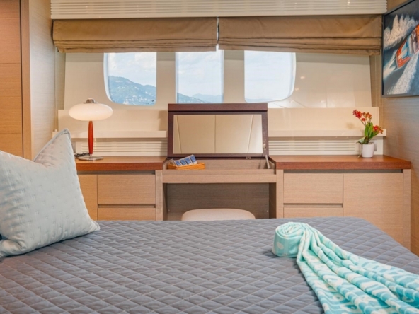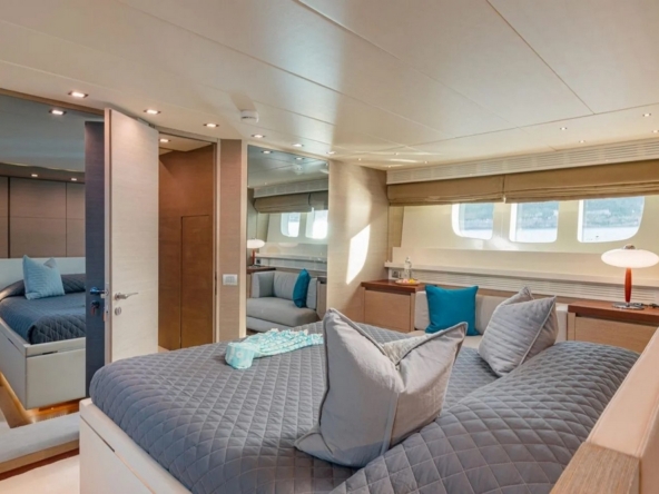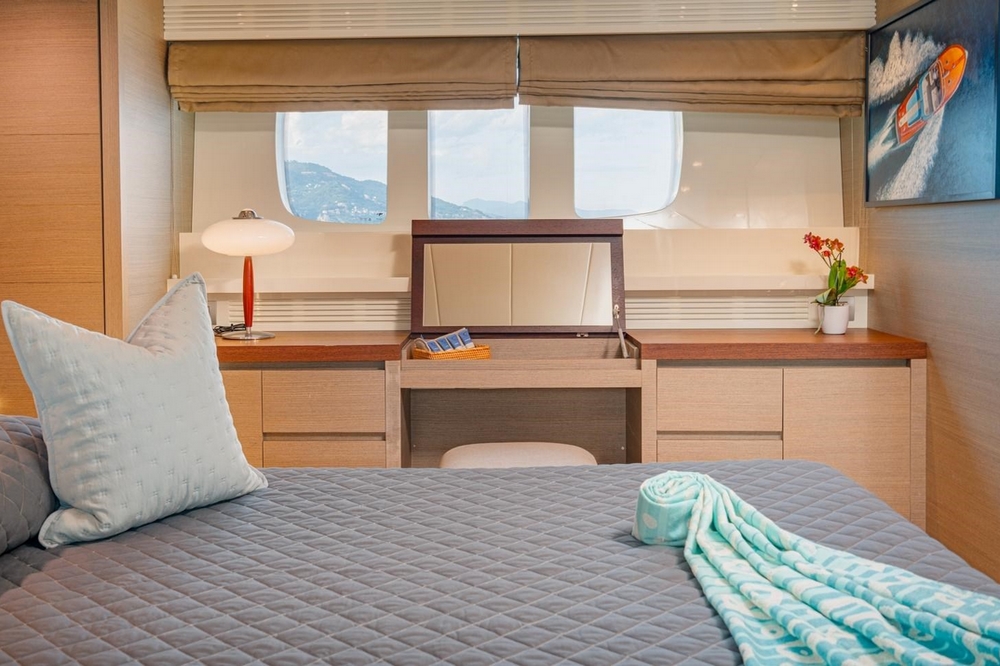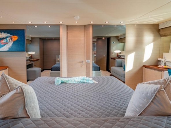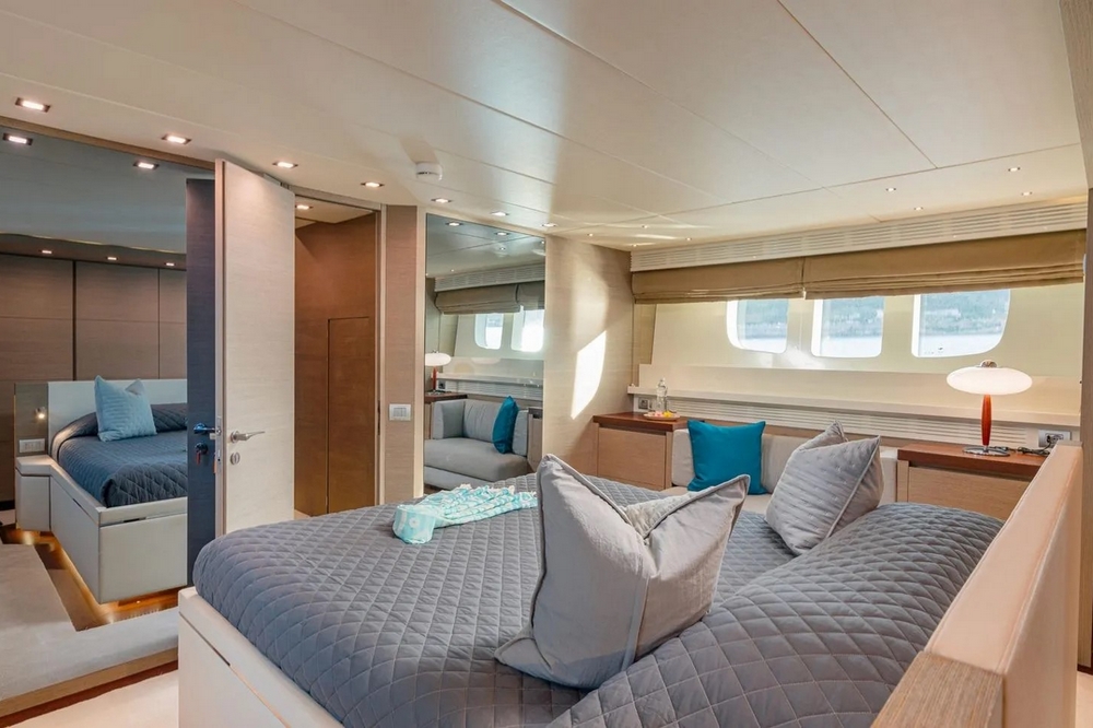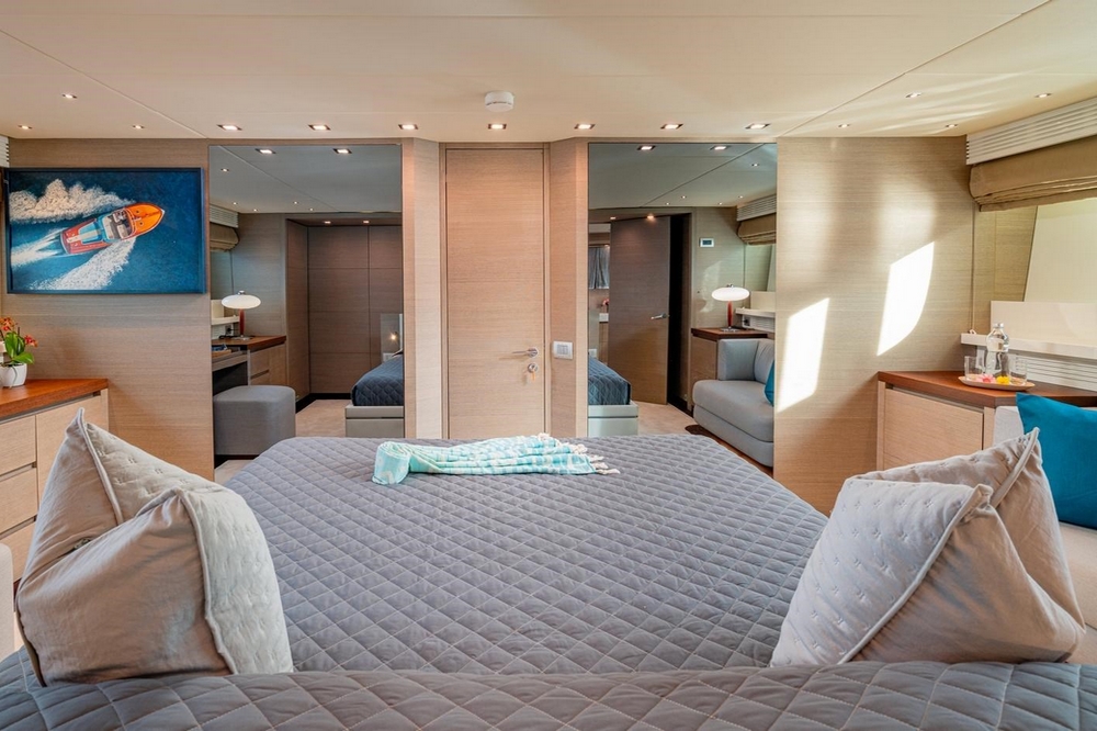 The owner's suite occupies the full beam amidships. It is furnished with a king-size bed, a sofa, a vanity, and