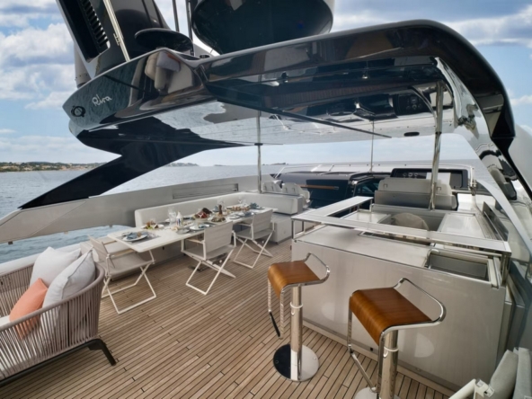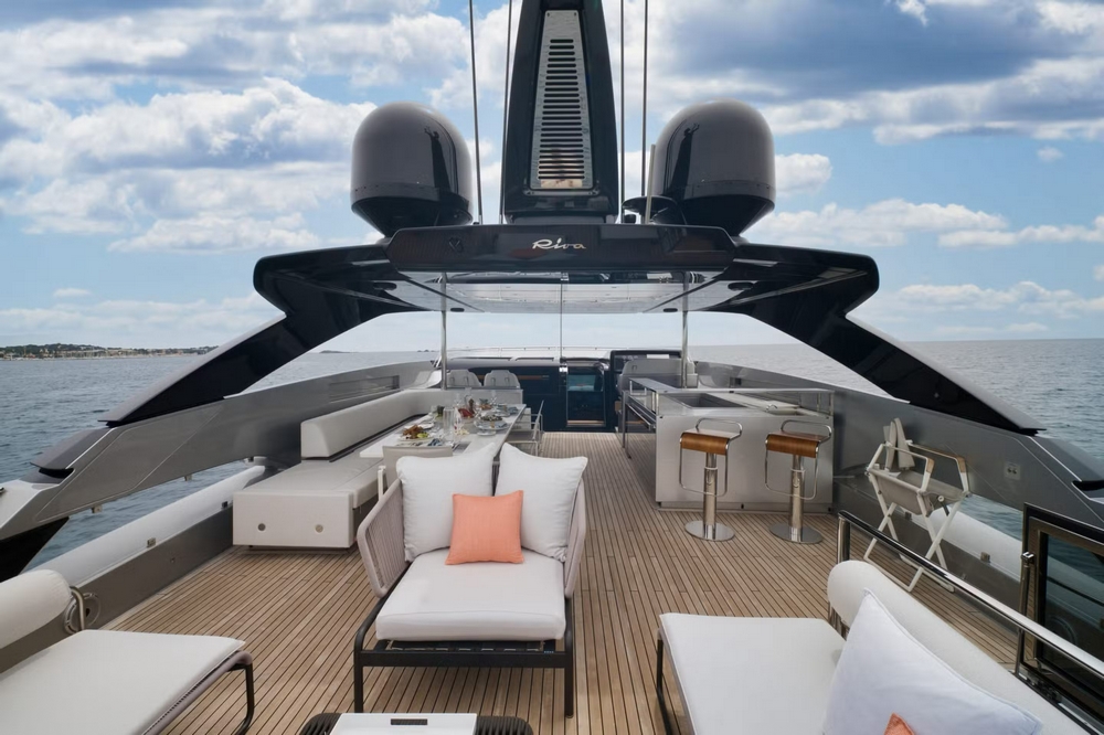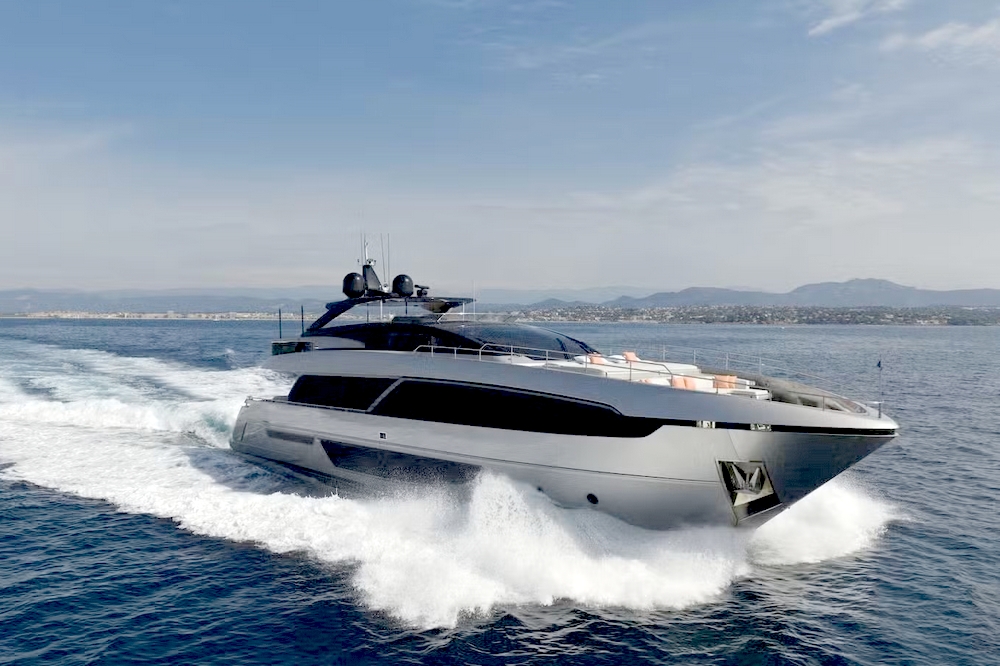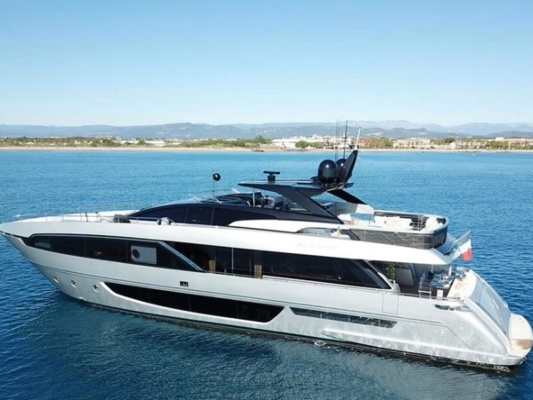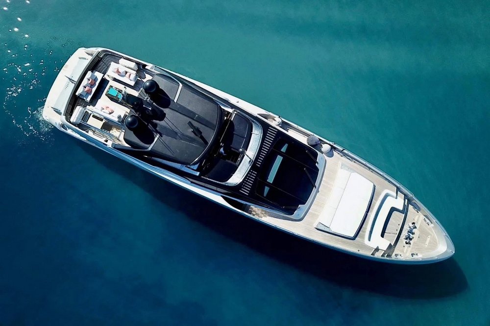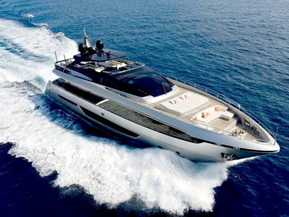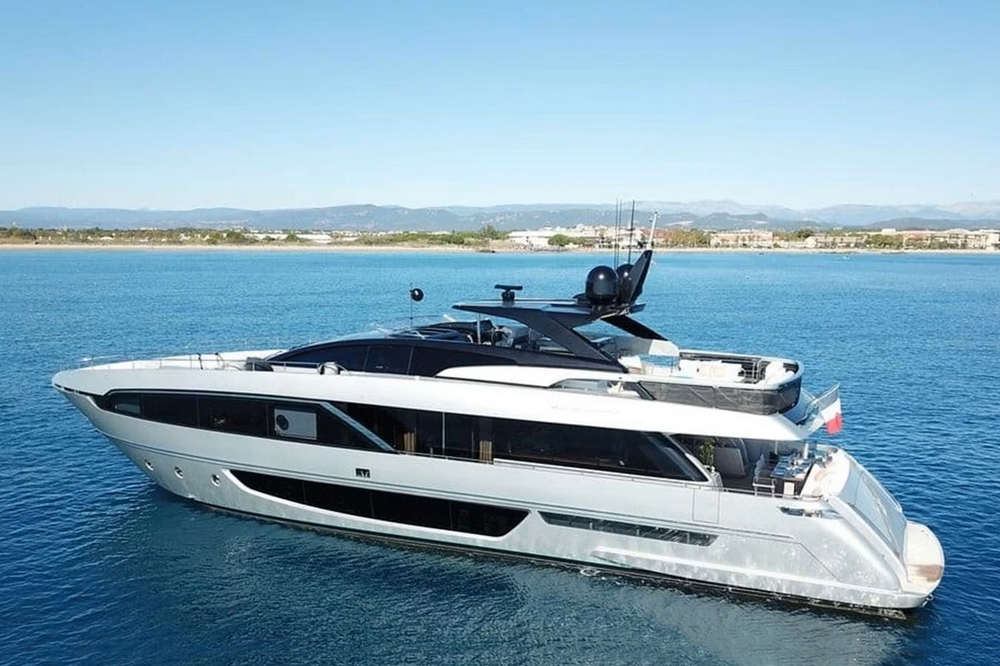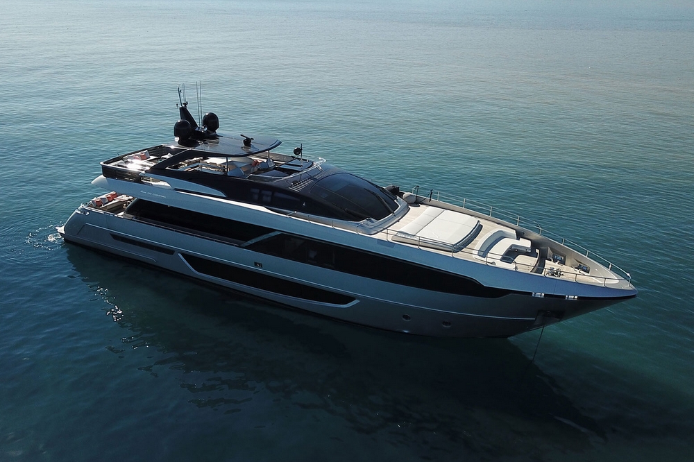 This exceptional yacht boasts powerful and elegant lines designed by the Ferretti Group. The metallic shark gray hull and black hardtop accentuate the boat's refined character. Built in GRP by the renowned Italian Riva shipyard, She is robust, seaworthy, comfortable, and exceptionally luxurious.