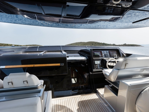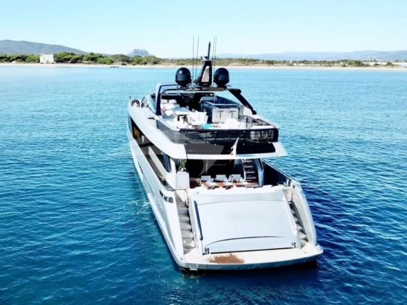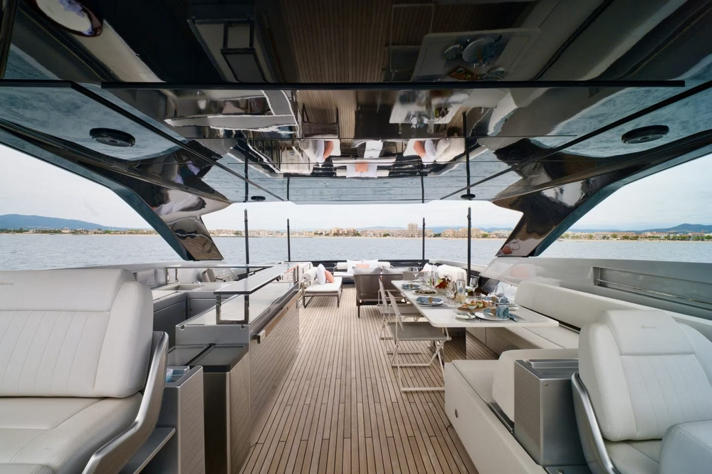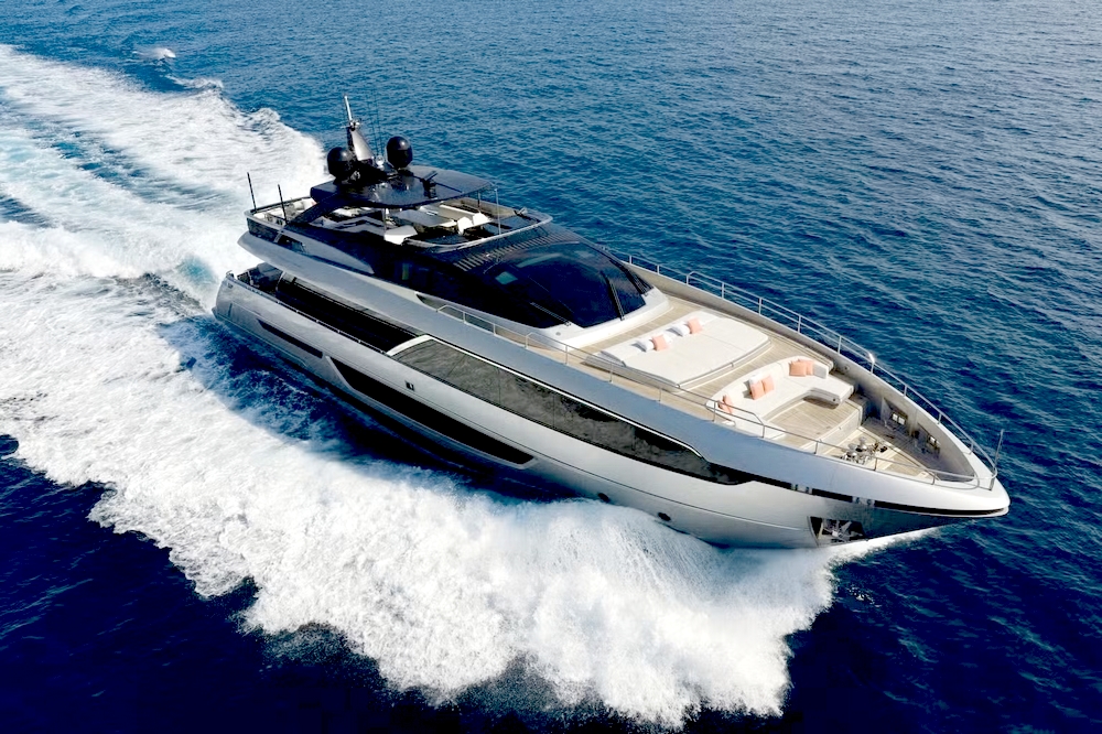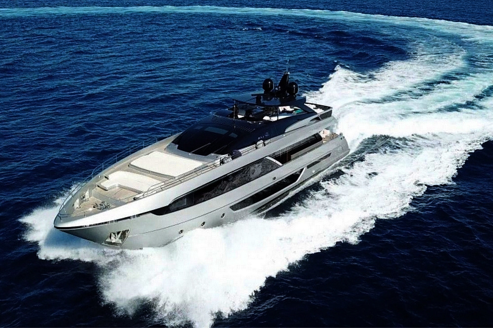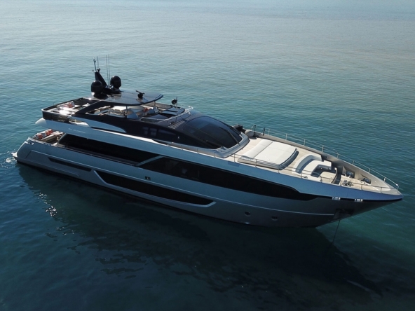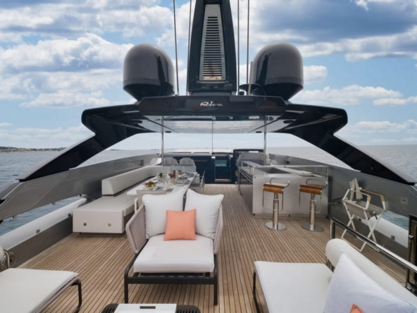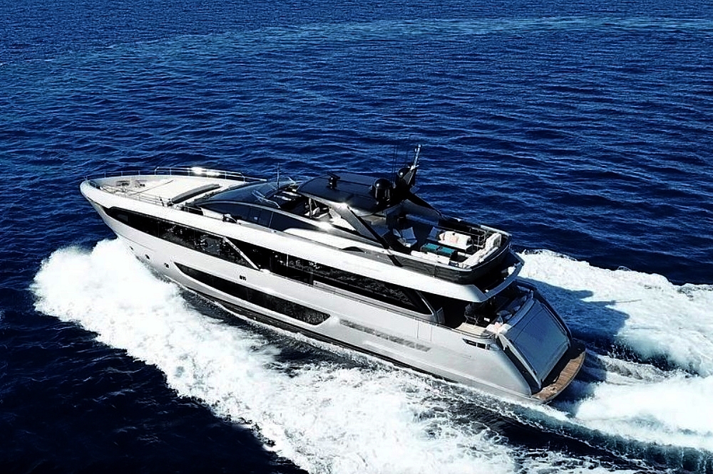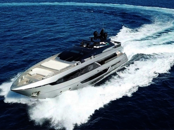 This exceptional yacht boasts powerful and elegant lines designed by the Ferretti Group. The metallic shark gray hull and black hardtop accentuate the boat's refined character. Built in GRP by the renowned Italian Riva shipyard, She is robust, seaworthy, comfortable, and exceptionally luxurious.