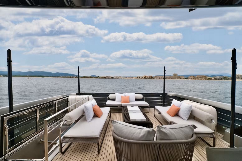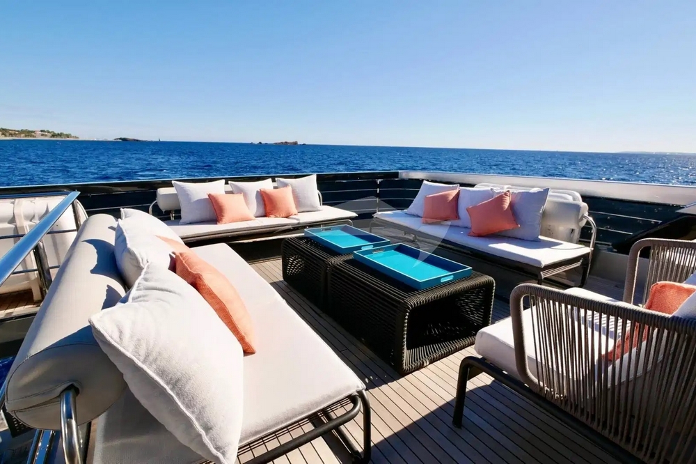 The expansive foredeck features sunbathing and a U-shaped sofa. This area can be shaded by a canopy stretched between six carbon fiber poles.