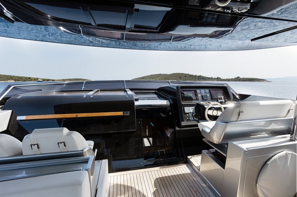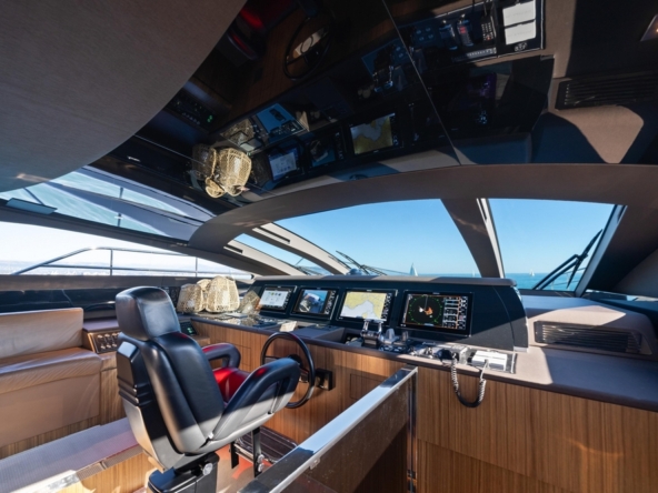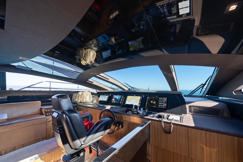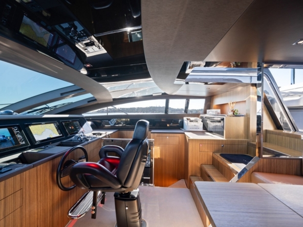 The large, raised wheelhouse is modern, with a majestic full-width instrument console, a wheel, a comfortable leather helm chair, and a settee to port.