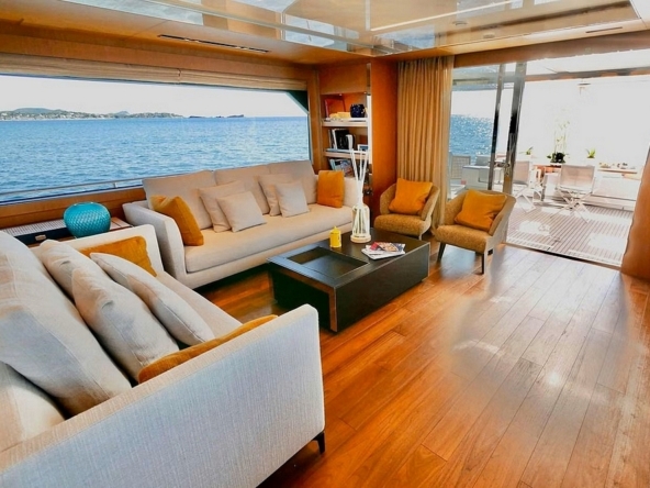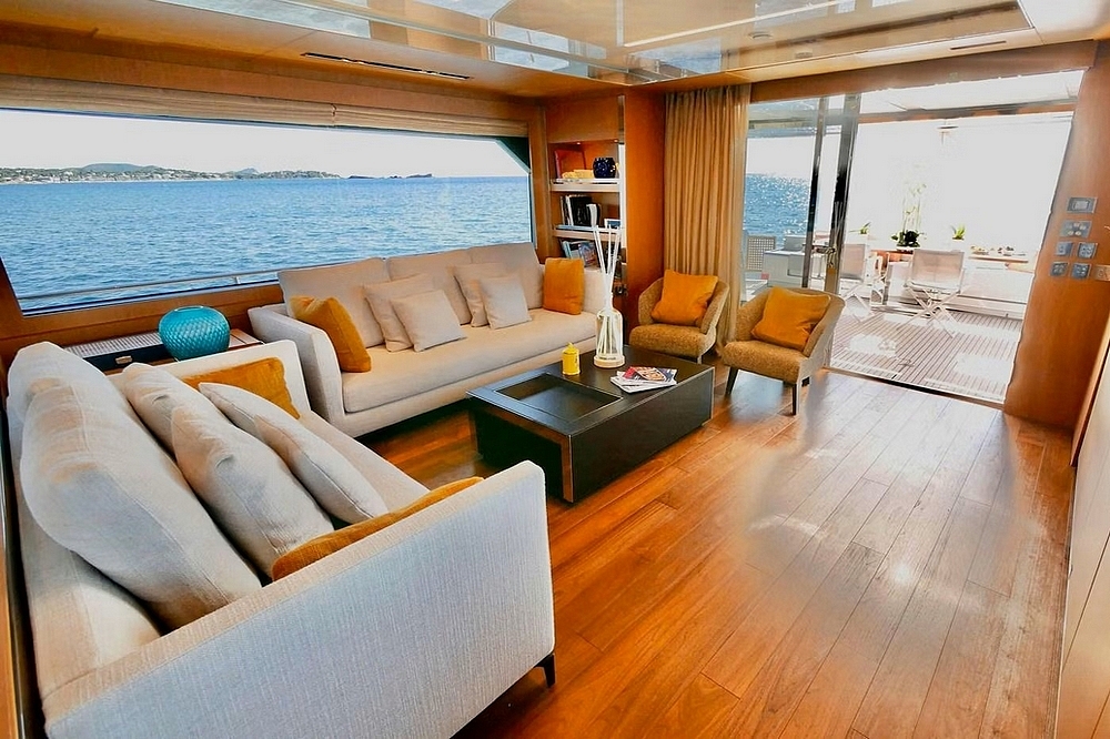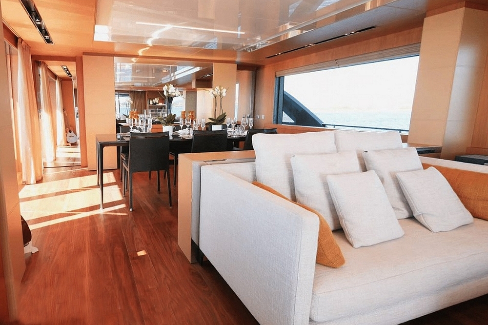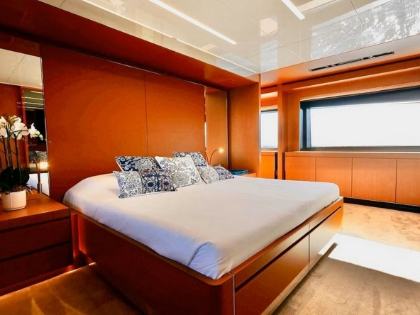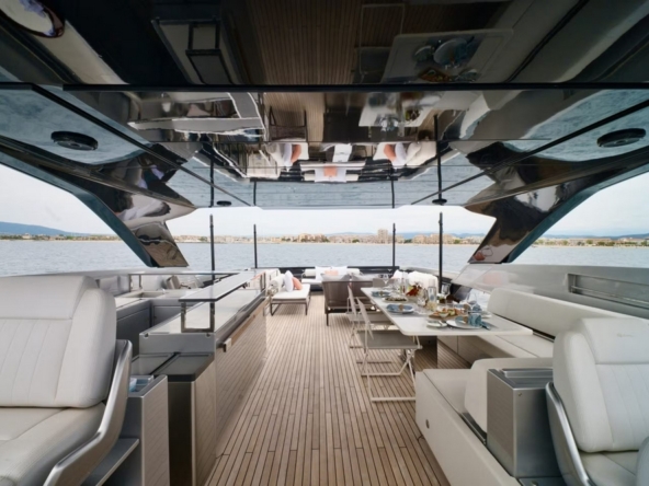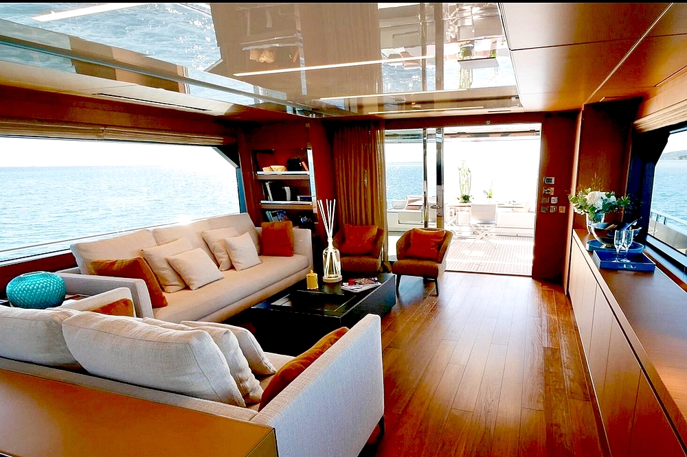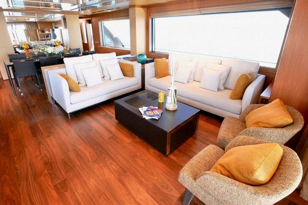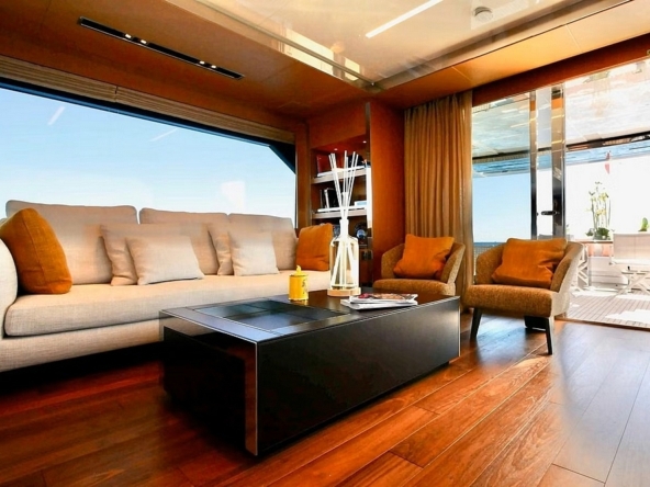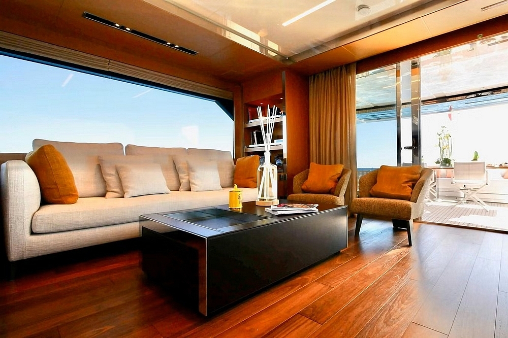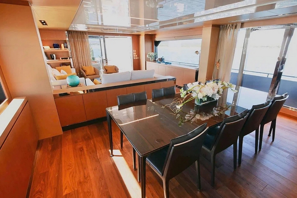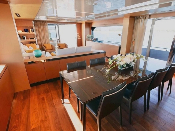 As soon as you step through the sliding glass door leading into the main deck, you discover a space flooded with natural light thanks to the large side windows. Designed by Officina Italiana Design in a contemporary Italian style, the saloon/dining area is warm and inviting. It is luxuriously furnished with modern and elegant walnut furniture.