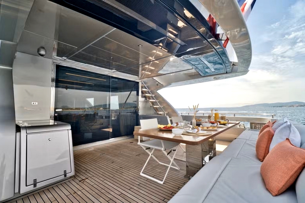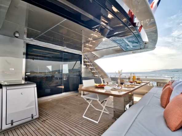 The cockpit is configured as an outdoor dining area, with a bench seat and four folding chairs surrounding the table. A bar unit completes this setup.