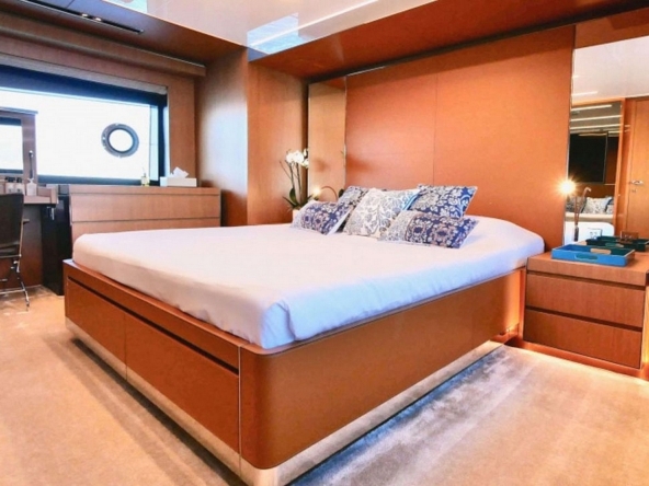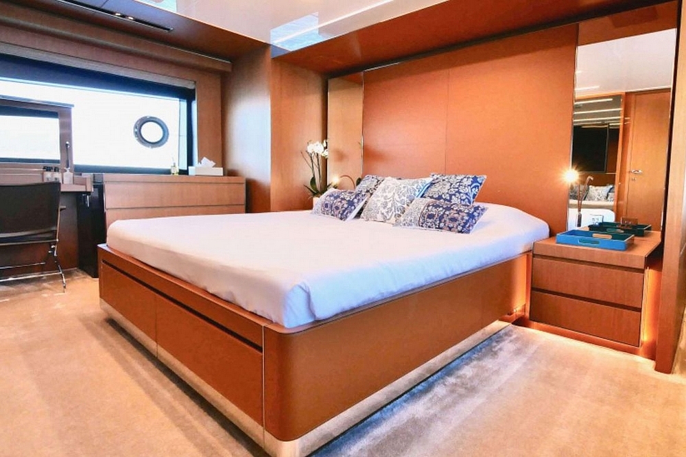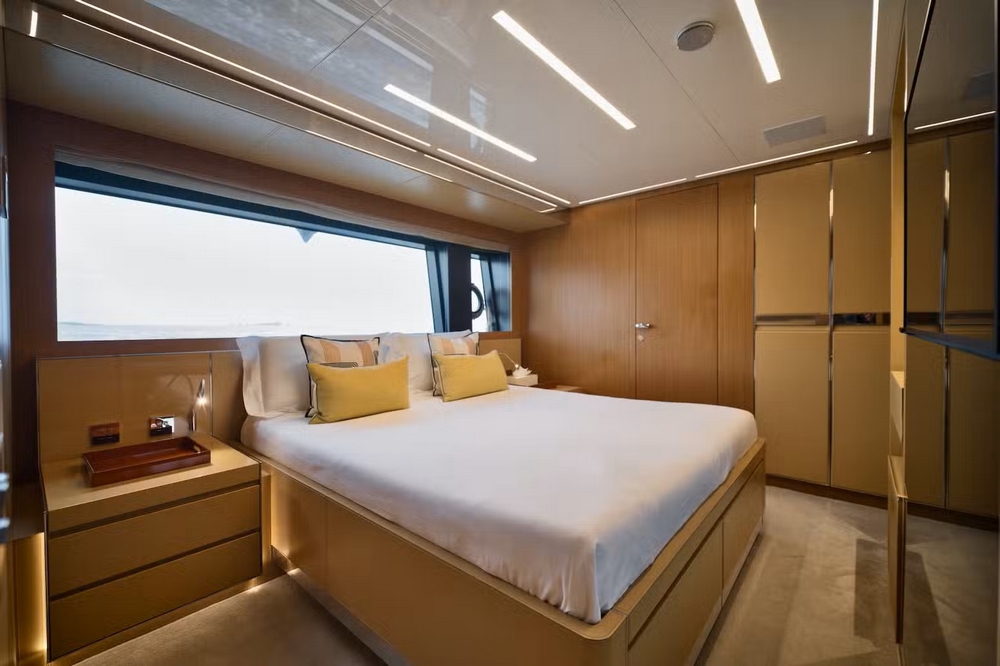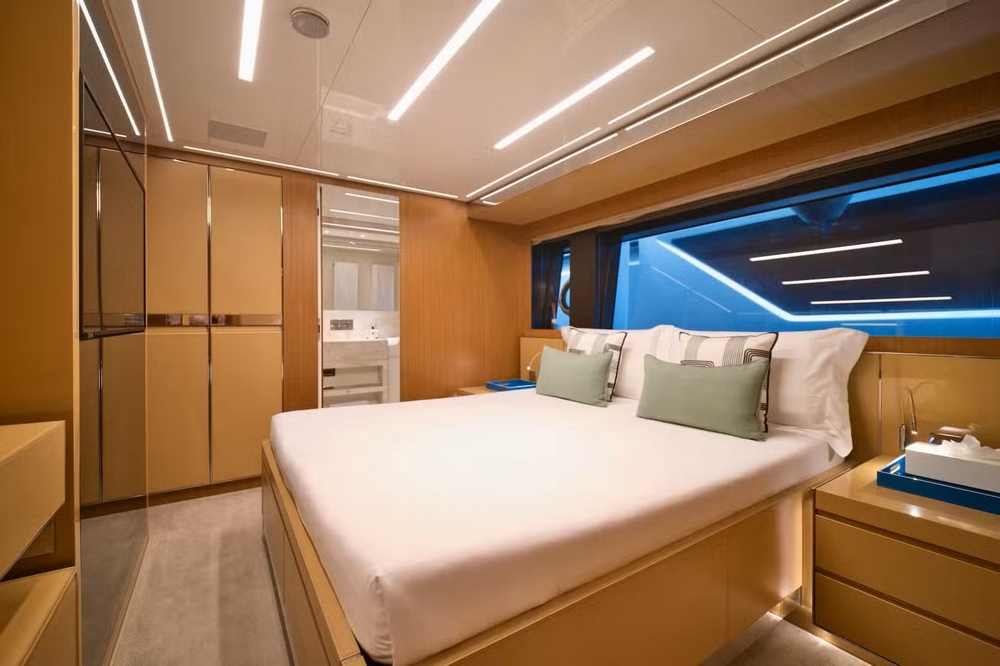 A day head is in the port passageway leading to the owner's suite. This spacious suite features a King-size bed facing a mirror with an integrated 49-inch TV, a vanity, a large walk-in closet, and an en-suite bathroom.