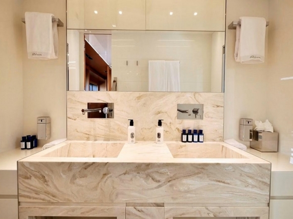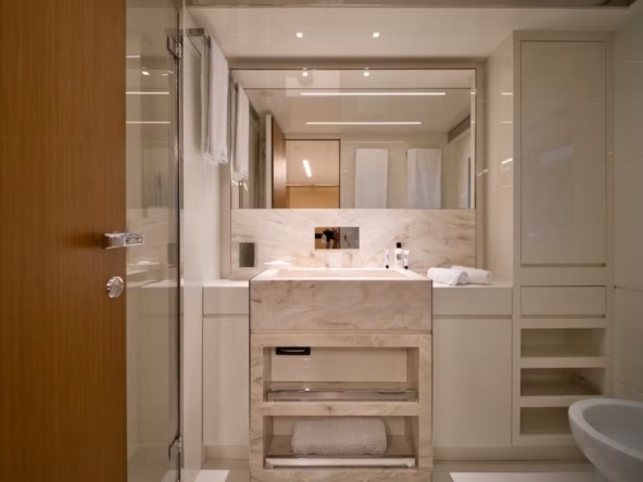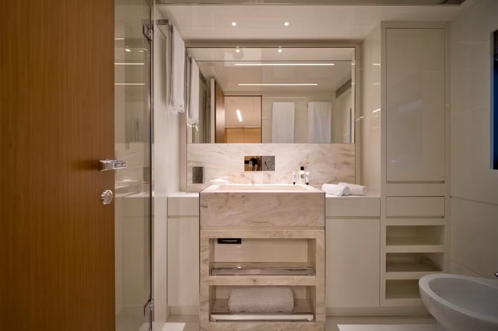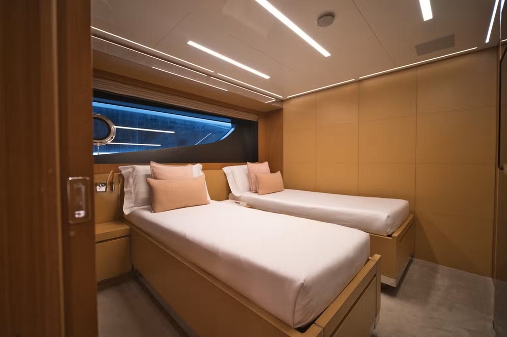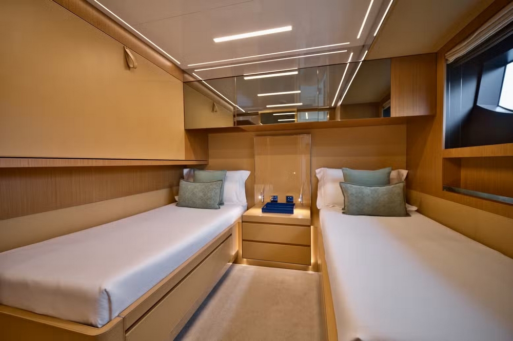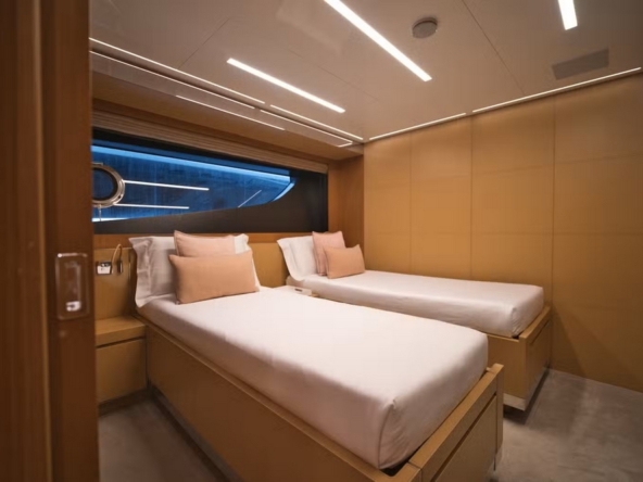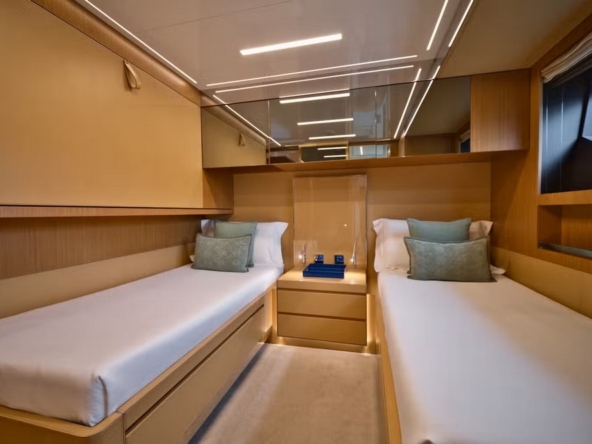 . The midship-third is dedicated to the sumptuous guest cabins: two cabins with Queen-size beds and two cabins with