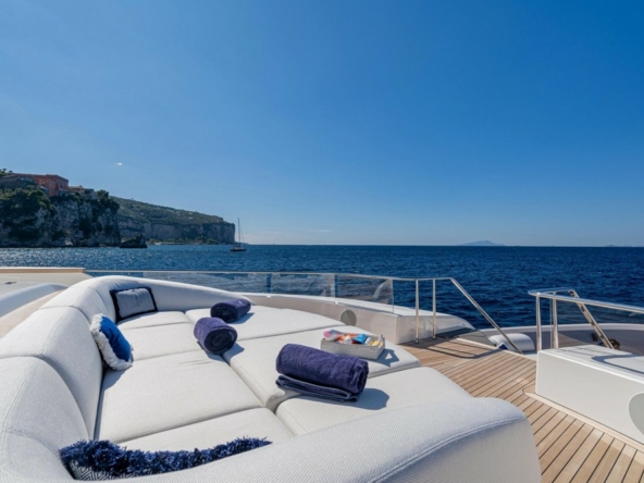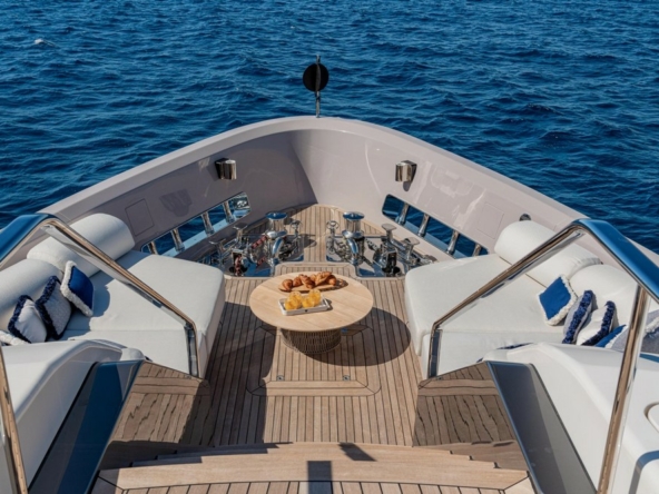 From the walkway, we can access the forward terrace, furnished with a lounge area featuring a U-shaped settee around an adjustable table on a gas spring, which can be converted into a sunbathing. This forward terrace can be covered by a sun awning attached to two stainless-steel masts. A staircase leads directly down to the forward main deck, where there is a sofa/sunbathing on each side with a round coffee table in the center.
