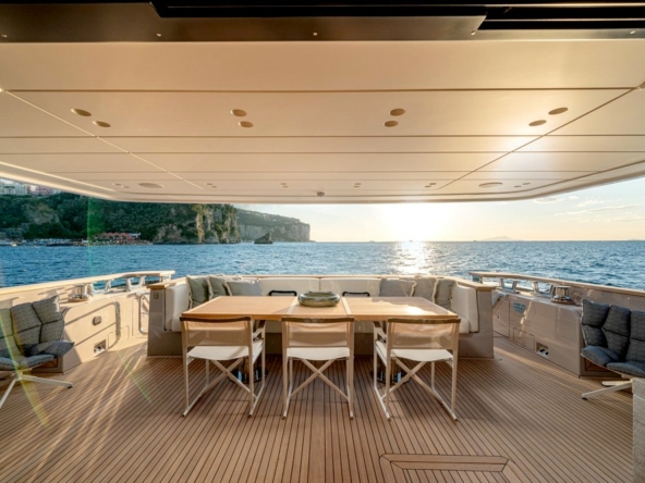 In the cockpit, the outdoor dining area is sheltered by the overhang of the upper deck. The large teak table is surrounded by a full-width bench seat and three folding chairs. The equipment is completed with two armchairs and a security camera.