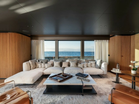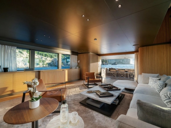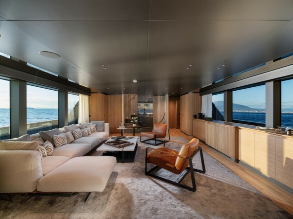 The spacious saloon occupies the entire area with its L-shaped sofa, two leather armchairs, and a large coffee table facing a storage unit to starboard, which also houses the 50-inch television. This inviting space is bathed in light thanks to six large side windows.