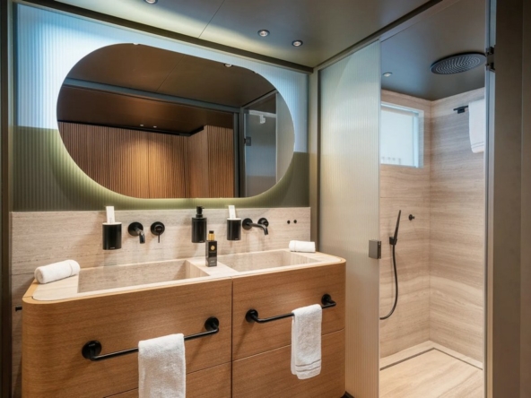 Toward the bow, the large, all-white galley is very modern and fully equipped with Miele appliances: 90 cm induction cooktop and extractor hood, combination oven/microwave, dishwasher, refrigerator and freezer, wine cellar for 64 bottles, and a dumbwaiter.