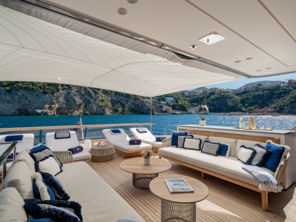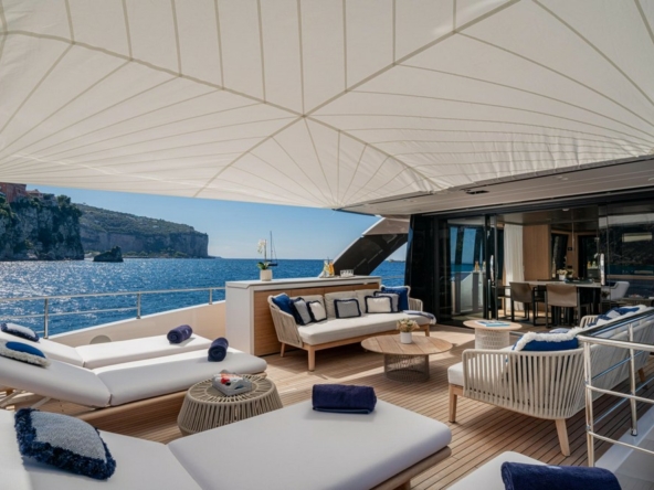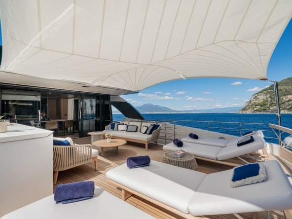 The aft on the upper deck includes four sun loungers and a coffee table. A lounge area with two sofas and two coffee tables occupies the midships, while a bar unit, equipped with a sink, barbecue, refrigerator, and icemaker, is located to port. This area includes a large cinema screen and can be shaded by an awning.