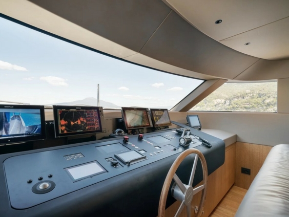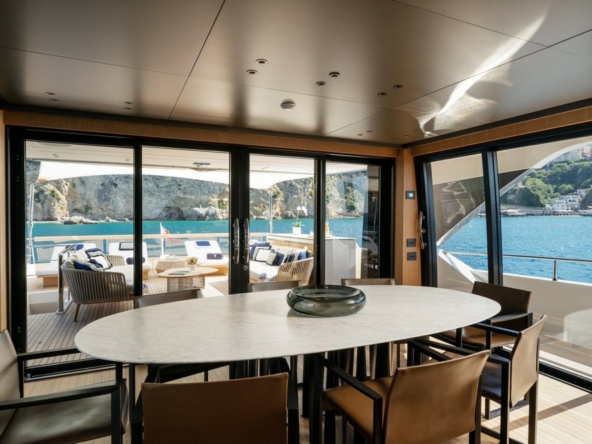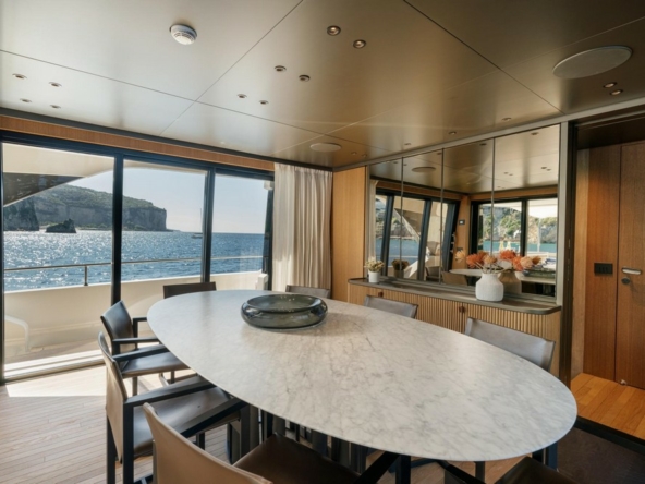 Inside, the dining room for ten, with its beautiful oval marble table, is accessed via sliding doors on three sides. The wheelhouse is located forward. It is equipped with the navigation instrument console, the steering wheel with its helm seat, a desk to port, and a watertight door providing access to the walkway that runs around the entire upper deck.