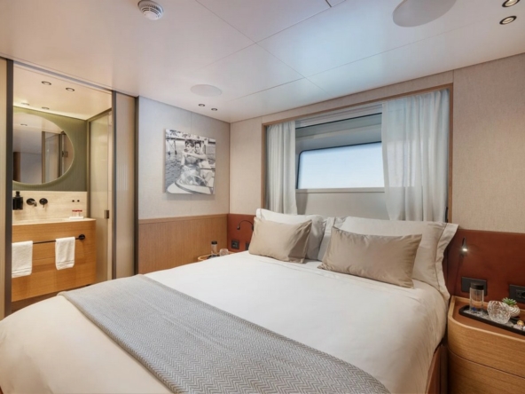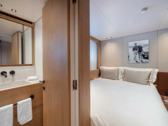 There is a day head in the passageway leading to the owner's suite, which spans the entire beam of the boat. It is furnished with a king-size bed facing a 40-inch television, a sofa, a dressing, and storage. Its bathroom has two sinks and a light marble shower, and a separate toilet.