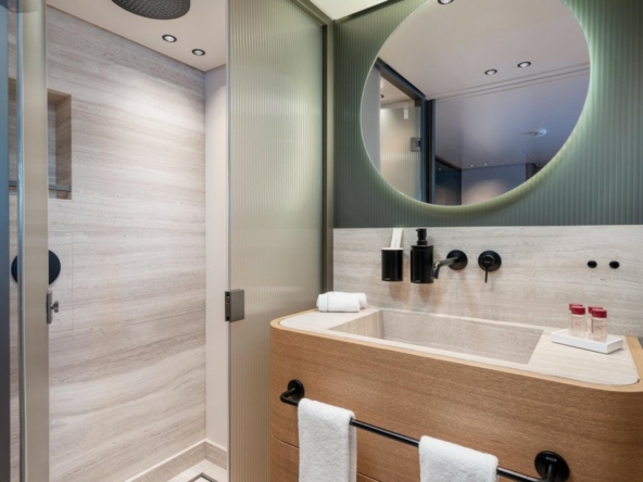 Inside, the design by Patricia Urquiola is modern and luxurious, adorned with an elegant fluted wood pattern.